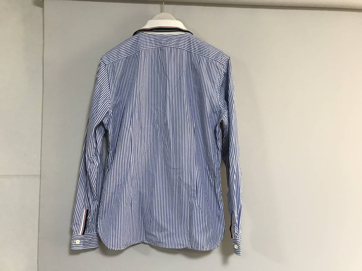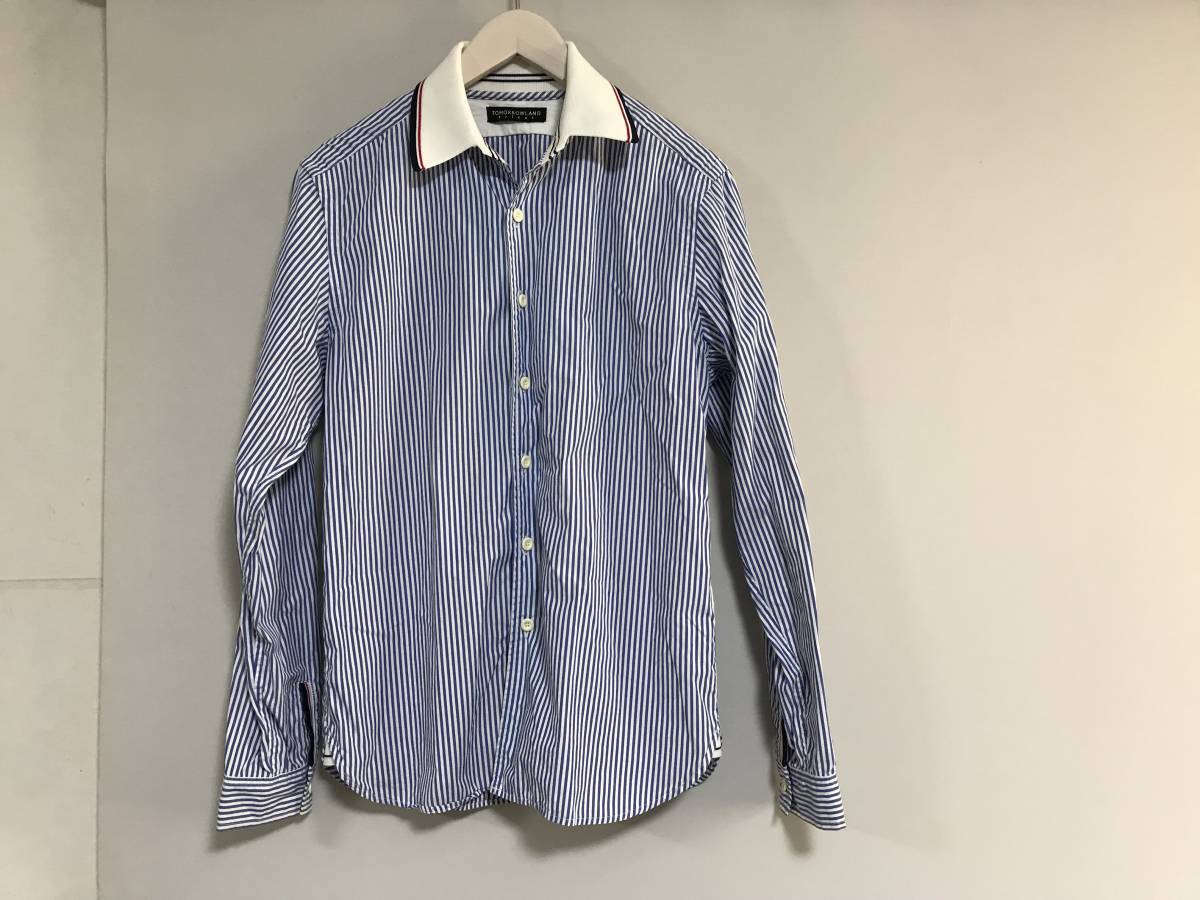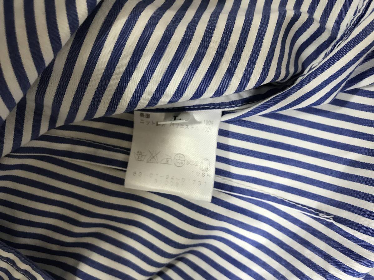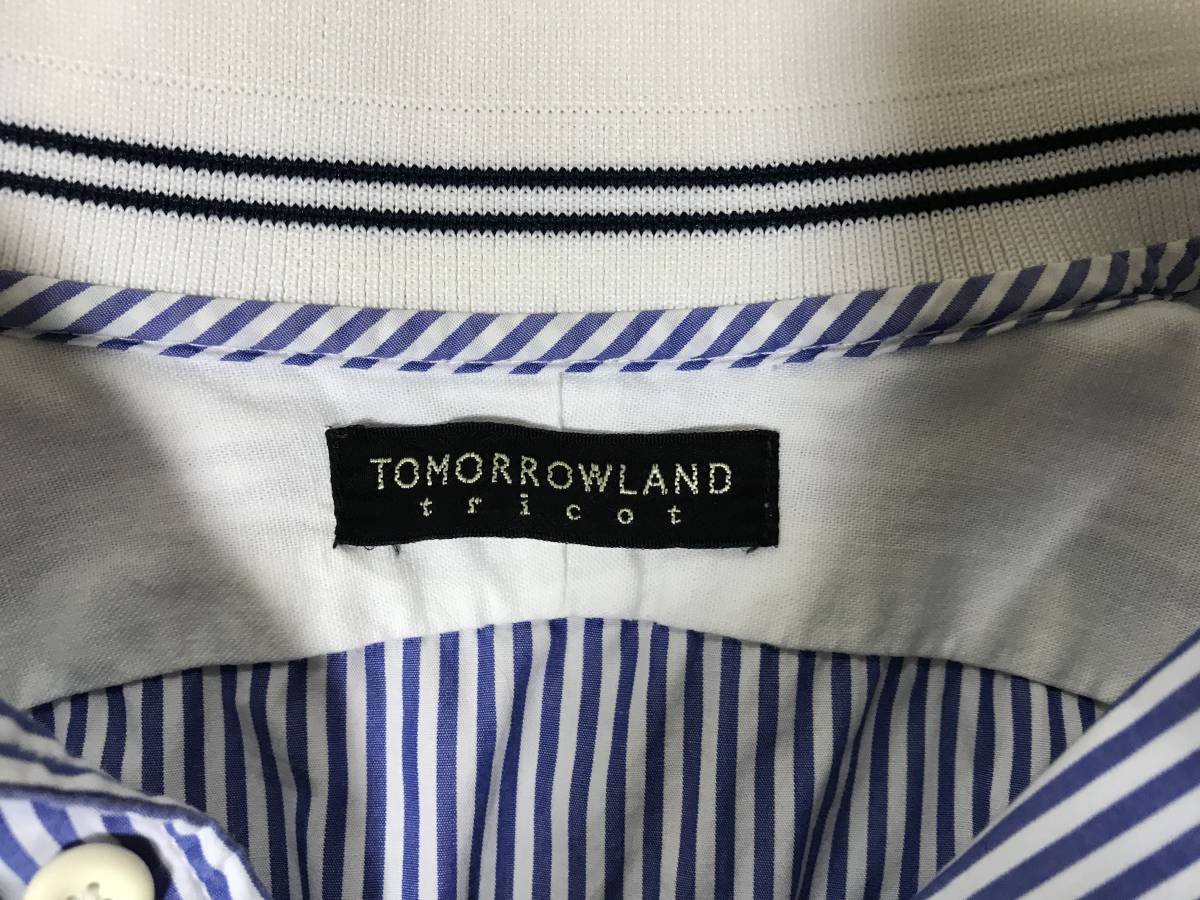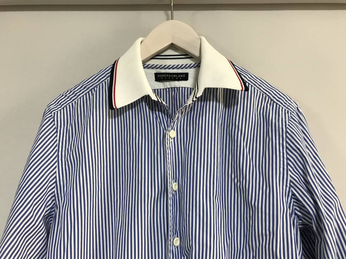 商品名:美品本物トゥモローランドTOMORROWLANDストライプ襟ニット切り返し長袖ロングシャツ白ブルーLメンズビジネスパーティースーツ日本製