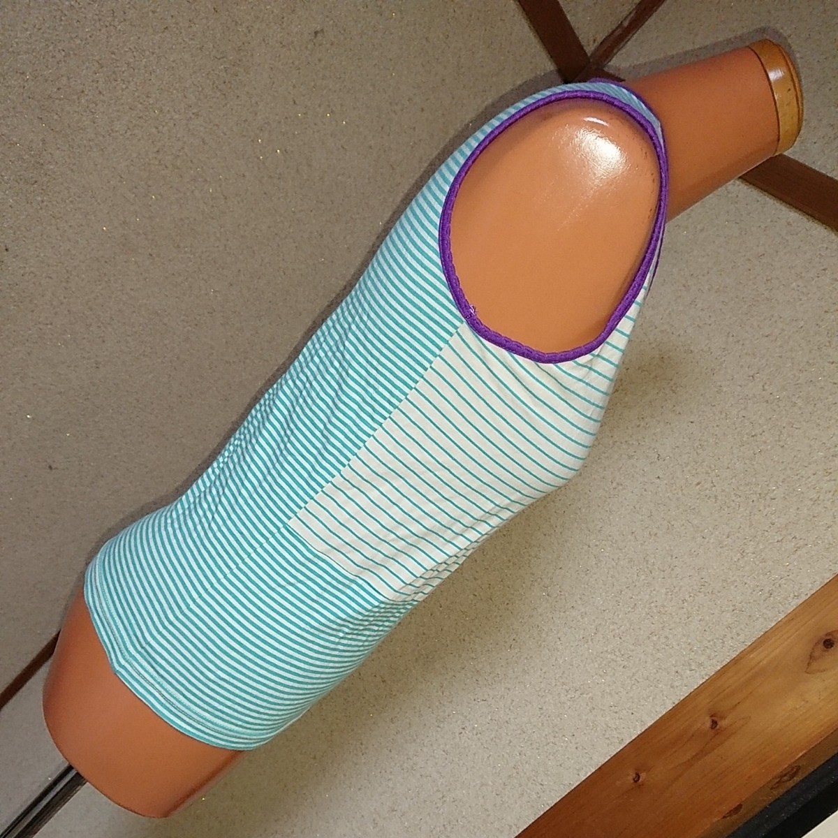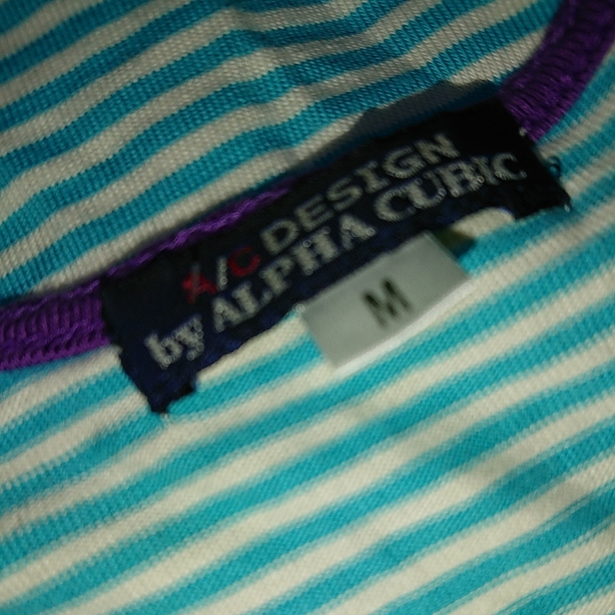 ホワイト×ブルーの2種類のボーダー柄に襟ぐりと袖口はパープルのレトロポップなトップスです。