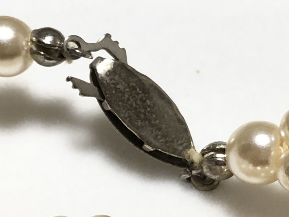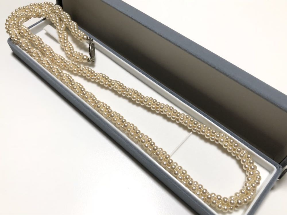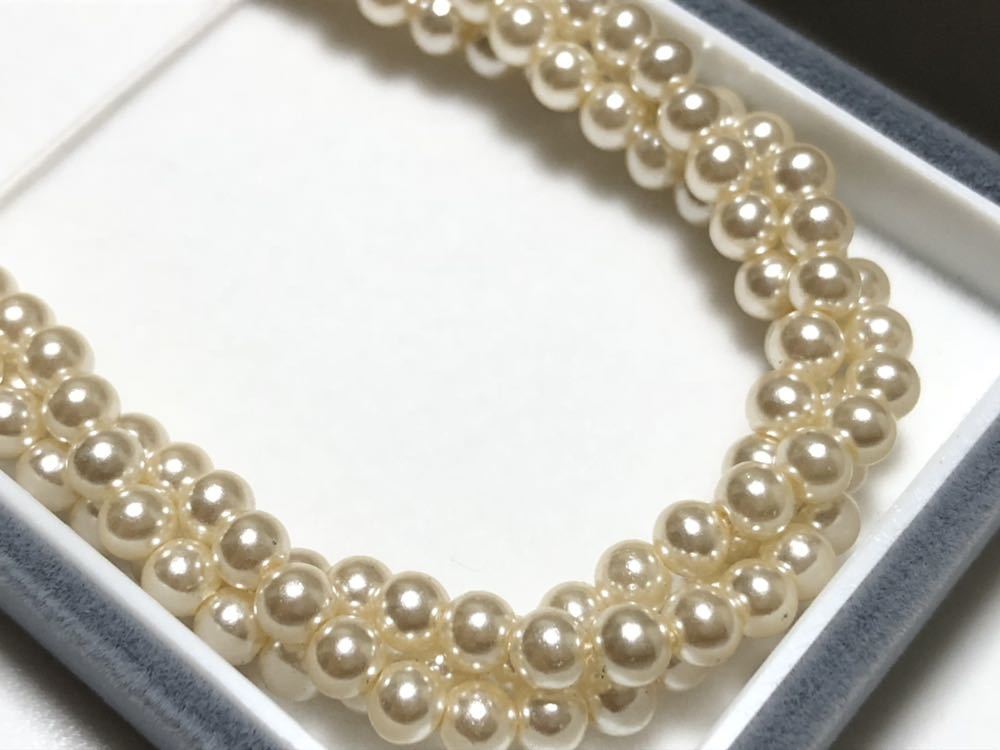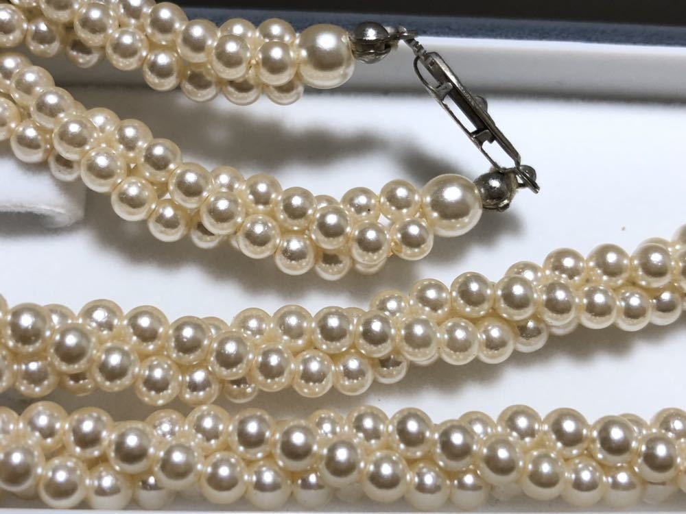 4㎜玉のフェイクパールを使用した、3連ツイストネックレスです。金属面にくすみがあります。