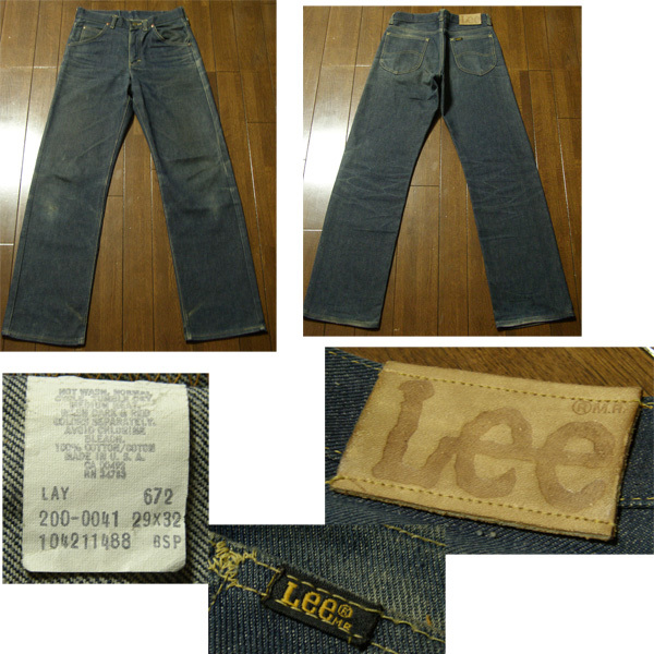 ヴィンテージ Lee 200-0041 デニム 29 X 32 です。状態は、古い物ですので、薄汚れやしみと、裾やひざ辺りに色落ちと、内ポケットに汚れがありますが(画像3)、ビンテージの雰囲気ある物です。アメリカで購入しました。内に200-0041 MADE IN U.S.A.のタグが付いています。ジッパーは、42 TALONです。古い物ですので、状態はそれなりですが、年代物の風格とレトロ感ある物です。サイズは29×32で、平置きの実寸は、ウエスト76cm 総丈 1m12cm、股下 82cm、裾幅 21.5cmです。ビンテージ物とご理解頂いて、ノークレーム、ノーリターンでお願いします。
