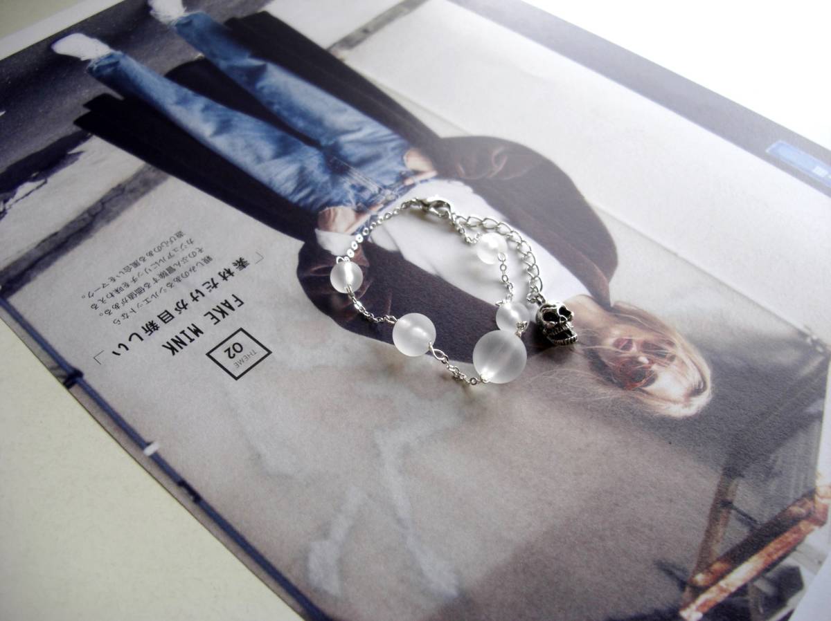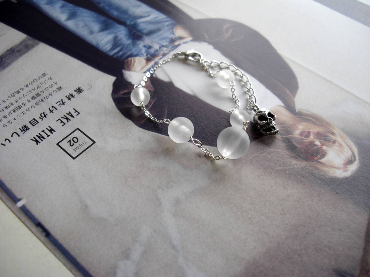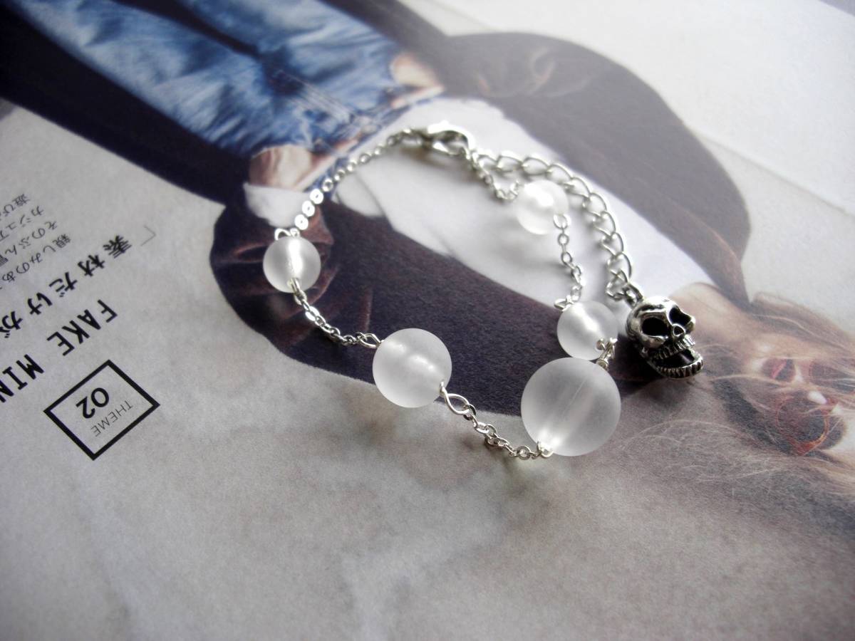 ロマンチックを追いかけて・・シリーズです♪透明感あふれる・・涼しげなフロストビーズのブレスレットです♪8ミリから12ミリ位までの大きさ違いのフロス トビーズを華奢なチェーンに紡ぎました♪軽いので色々な組み合わせで楽しんでいただけます♪長さは23センチ位で調節自由です♪お揃いのネックレスやピ アスも出品しています♪シンプルで長く着けられ るデザインを考えて作りました♪ハンドメイドをご 理解頂いてノークレーム、ノーリターンでお願いします♪