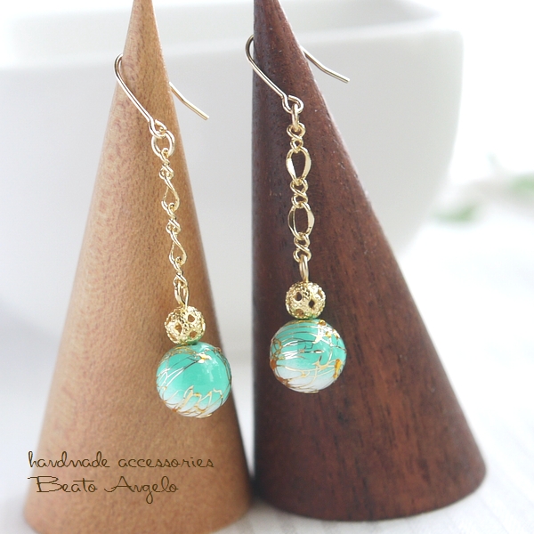 唐草ビーズと透かし玉のチェーンピアス(p-017)翡翠 G