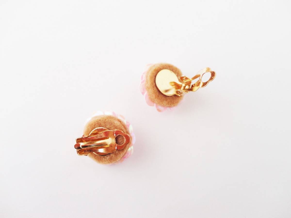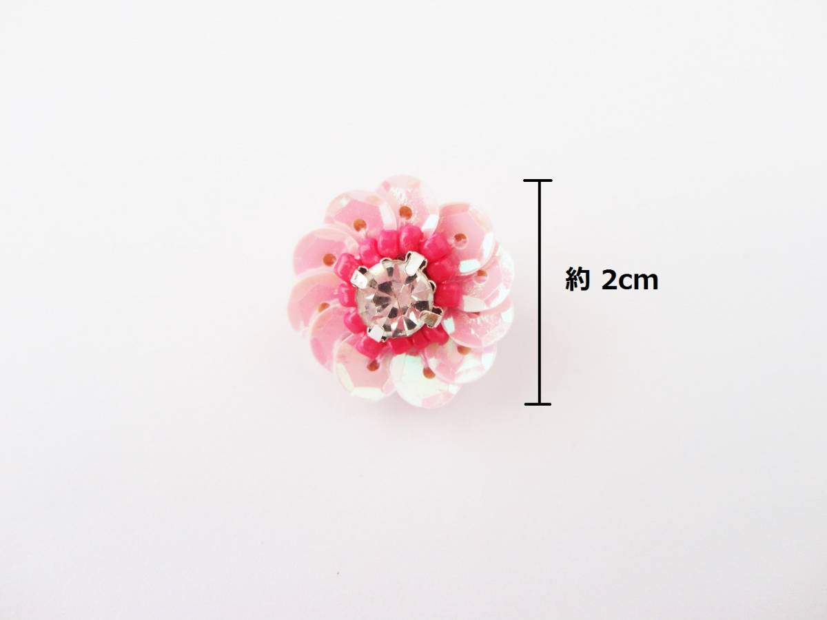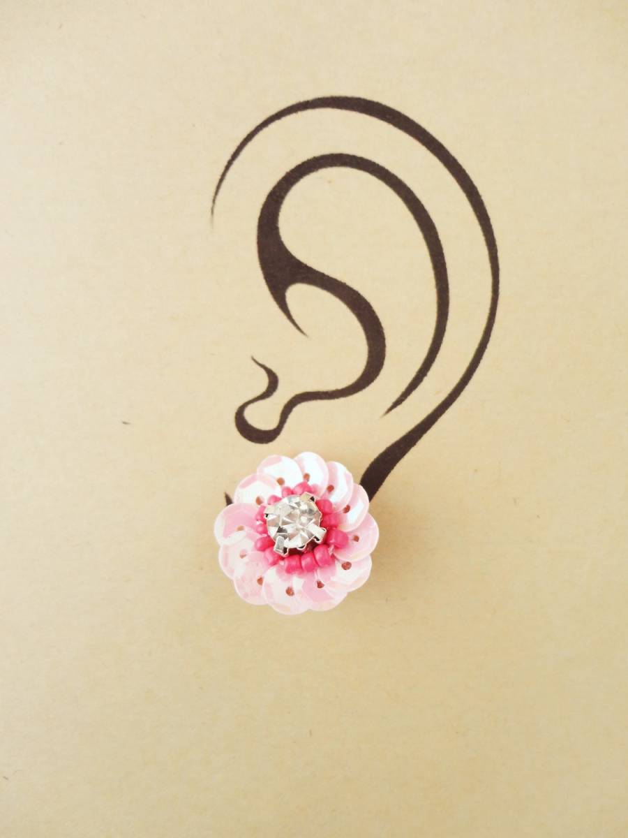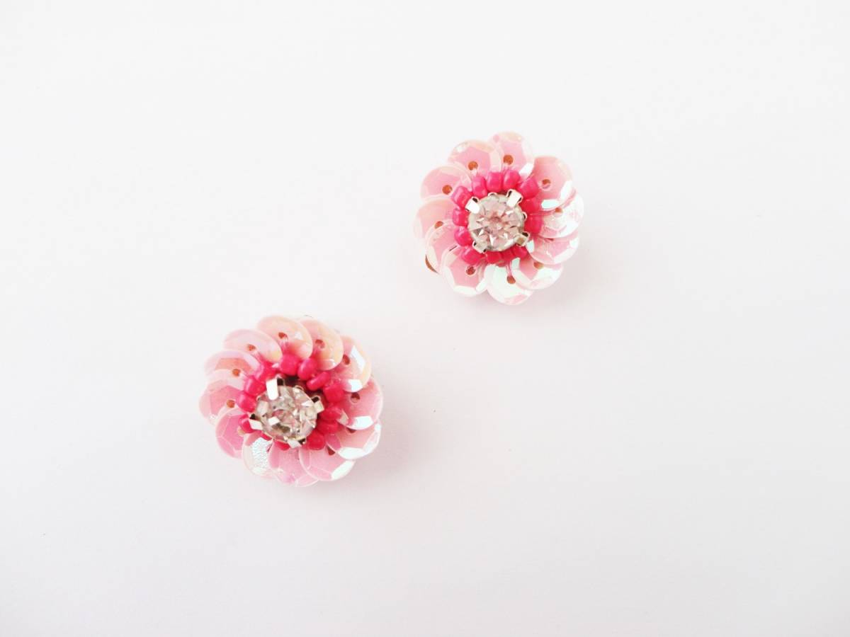 キラキラのスパンコールとビーズを、ひと針ひと針丁寧に刺繍したお花のイヤークリップです。