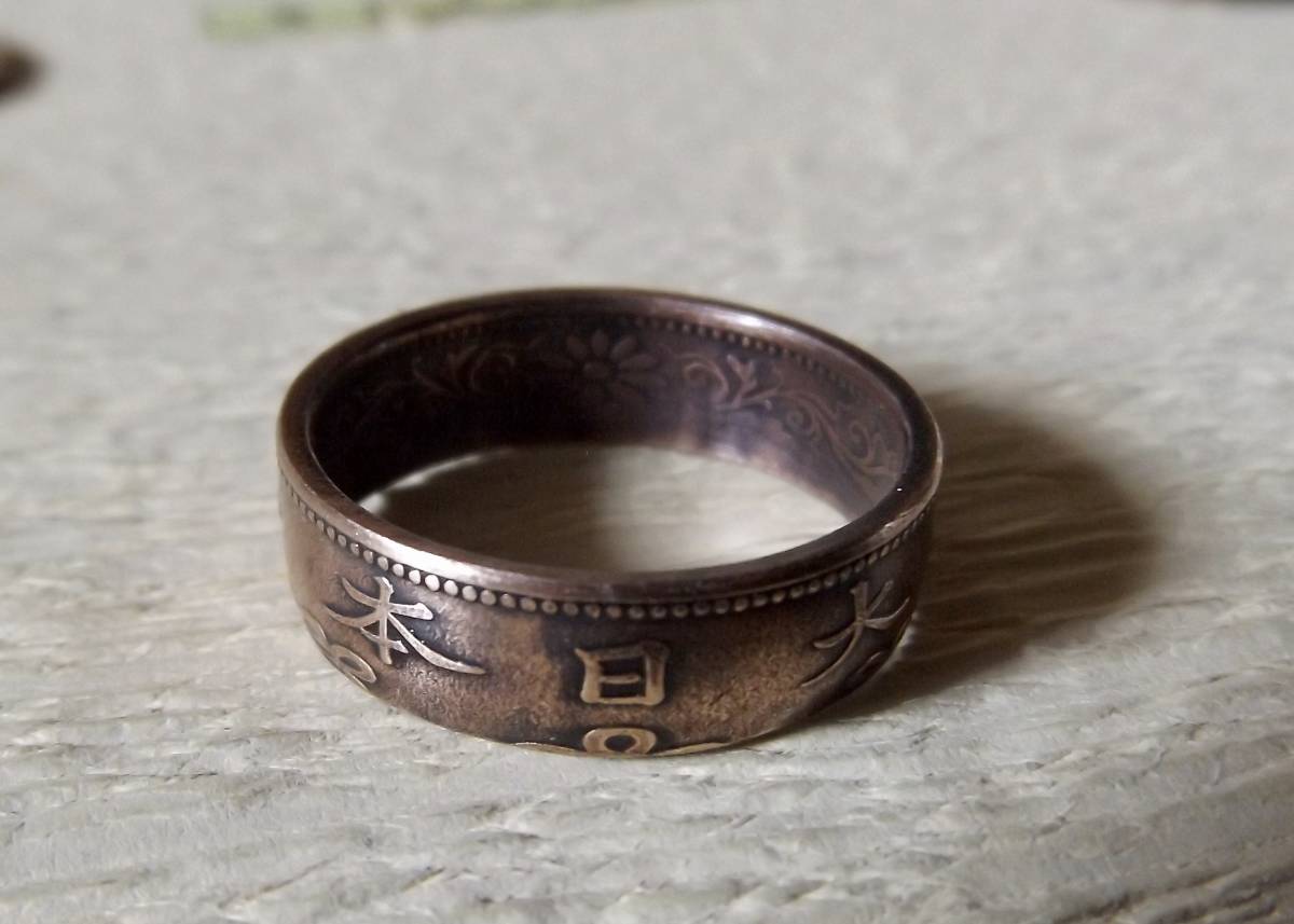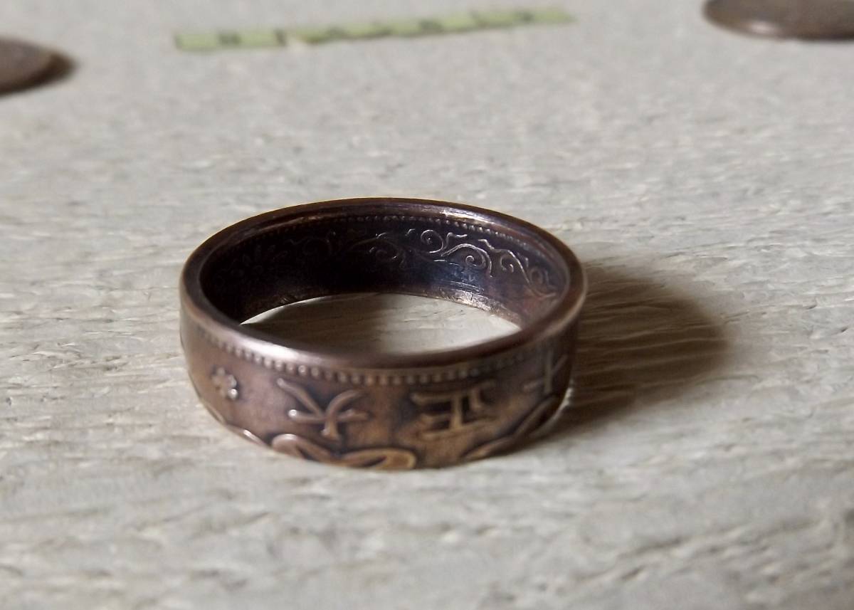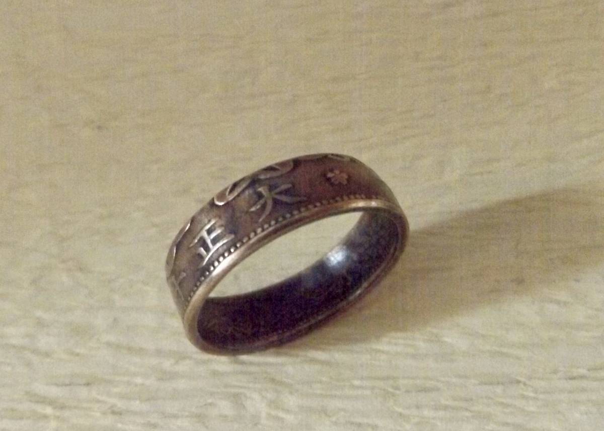 この商品は、大正11年発行の桐1銭青銅貨を使用。銅貨に穴を明け木槌で叩いてコインリングに成形した1点ものです。