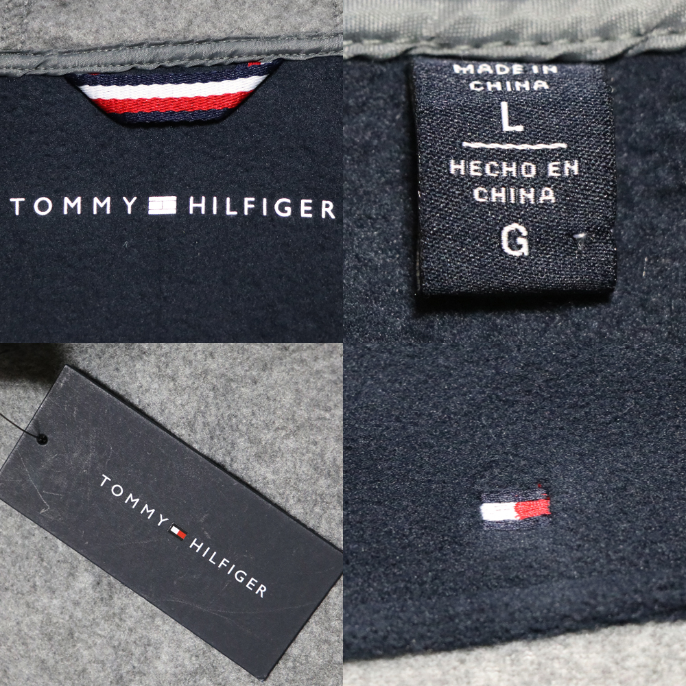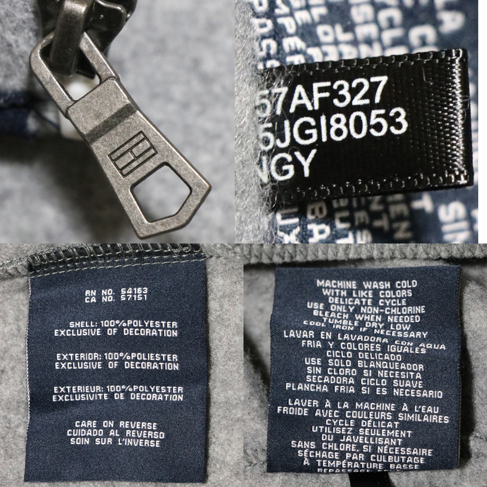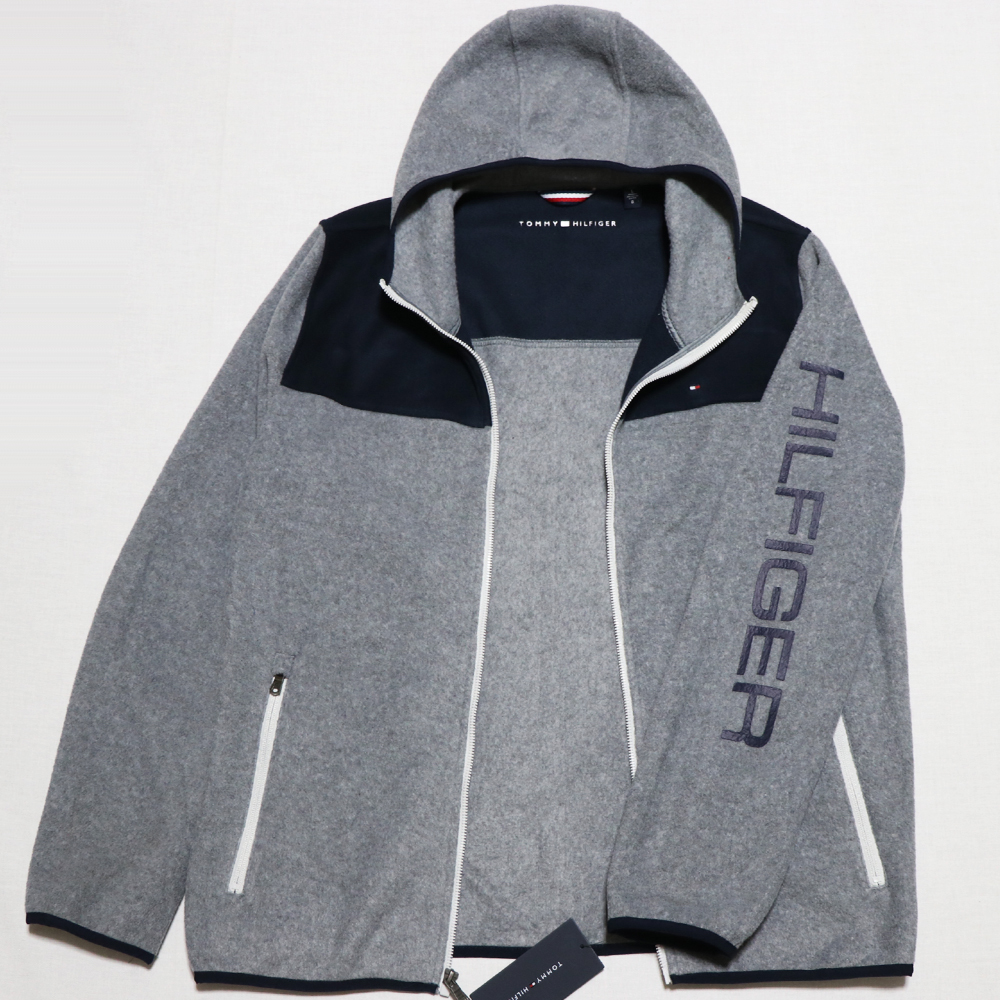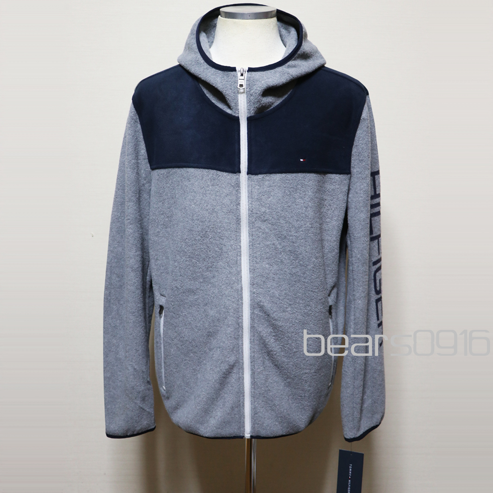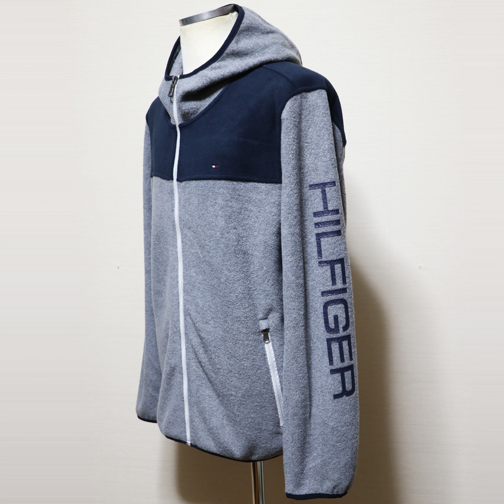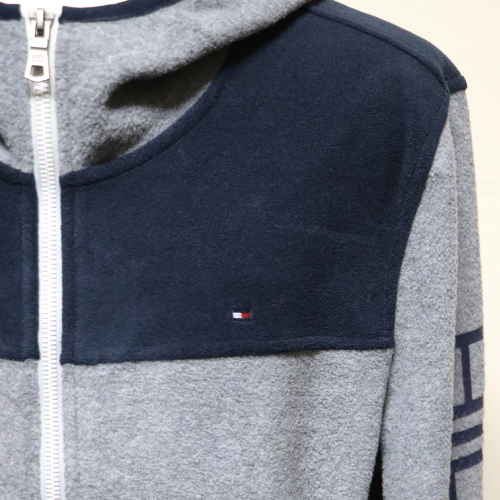 新品アメリカ購入のTOMMY HILFIGERトミーヒルフィガー 袖プリントフリースZIPアップパーカー紺灰Lサイズです。
