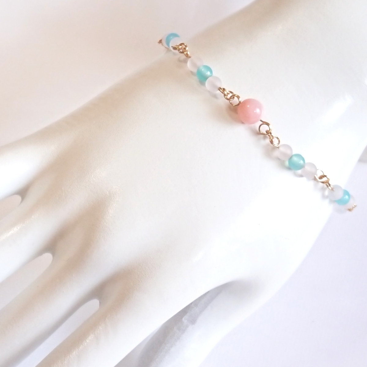 ピンクオパールとシーブルーカルセドニーとフロストローズクォーツを組み合わせたカラフルなパステルカラーがキュートなレディースブレスです。