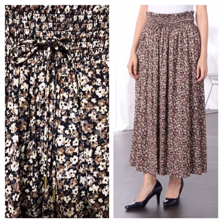ポリ素材で軽快に仕上げた小花柄のロングスカート。