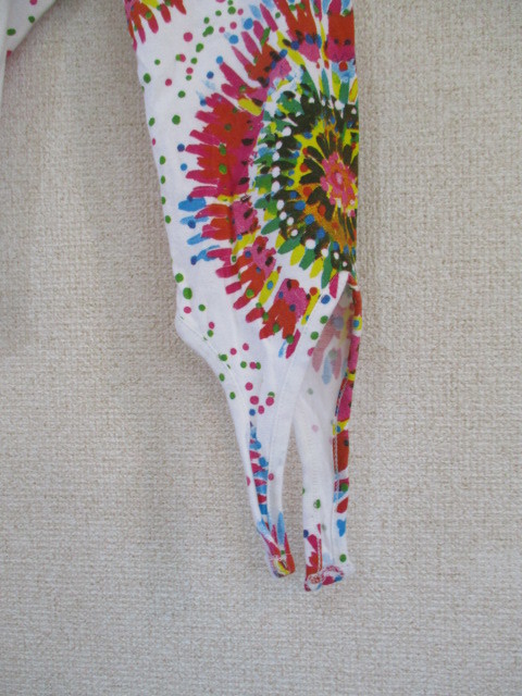 商品紹介 | 花火のようなカラフルなプロントがオシャレなスパッツです。 裾は外側で結んで着るデザインになっています。(写真は伸ばした状態で撮影しています。) 地色は白です。 《素材》 コットン95% 指定外繊維(エラスティン)5% |