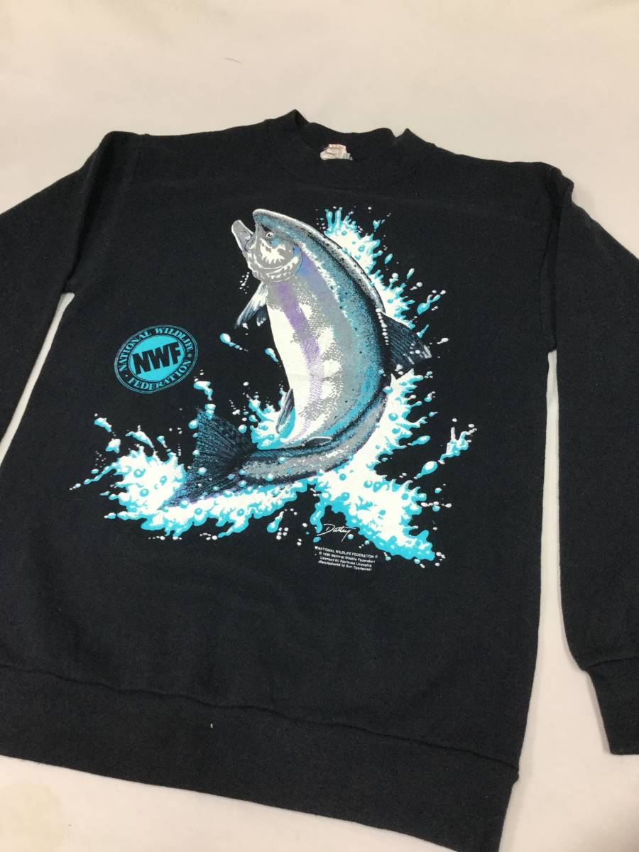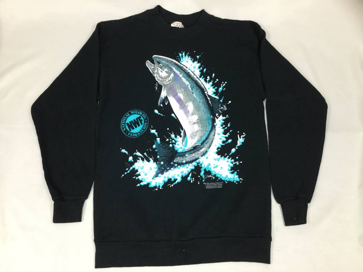 90s USA古着 SUN ビンテージ スウェット ブラック トレーナー フィッシング柄 NWF Mサイズ フィッシュ柄