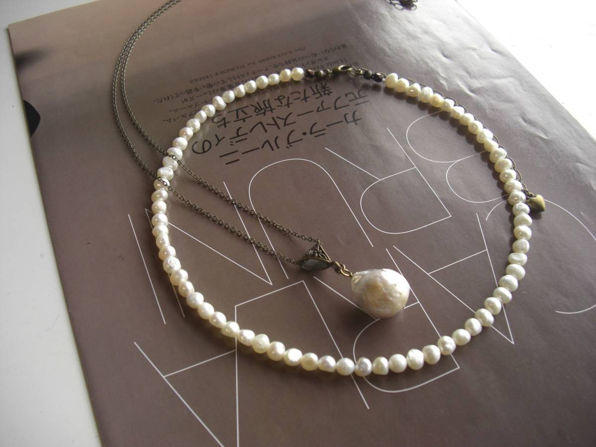 乙女の時間・・シリーズです♪バロックパールの魅力・・個性的なバロックパールと大きな一粒パールのネックレス2点セットです♪バロックパールのネックレス は6ミリ位のホワイトパールを繋いでロマンチックな表情です♪長さは40センチ+アジャスター12センチで最長52センチ位です。存在感のある20×15ミリ位の大きなバロックの一粒パールにはシックな座金と華奢なチェーンを合わせました♪長さは70センチ+アジャス ター10センチで最長80センチ位でトップは4センチ位です♪それぞれ単品やお揃いの ブレスレットも出品しています♪シンプルで長く着けていただけるデザインに仕立てました♪ハンドメイドをご理解頂いてノークレーム、ノーリターンでお願い します