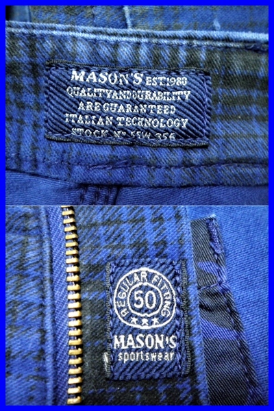 送料無料でお送りいたします(同梱不可)。 カラー:ブルー系シャドーチェック柄 サイズ:50(日本サイズでL-XL相当) 【実寸】 股下 87 股上 28 胴囲 86 裾幅 22 (当方素人採寸による実測のため、多少の誤差があるかと思います。ご容赦下さい。) ■ランク:C ■備考 ※古着ワークパンツとして程よいUSED感で穿きやすいです。 ※通常使用における洗濯による色落ち(ヒゲ、アタリなど)ありで雰囲気良いです。 ※特に目立つ汚れやダメージはなく状態はまずまずです。 ※素材は綿100%です。 ※生地はやや厚手のモールスキン地でしっかり、肌触りよく穿きごこち抜群です。 ※Mason'sのイタリア製、正規品です。 ※ベーシックなアイテムですので流行りにとらわれず永くご愛用いただけます。 ※完璧なお品をお求めの方、また中古品にご理解のない神経質な方におきましては、 恐れ入りますがご入札をお控え頂けますようお願い申し上げます。 -------------------------------------------- N:新品 S:未使用or新品同様のお品 A:コンディション良好な美品 B:使用感の有るまずまず良好なお品 C:全体的に使用感の有るお品 D:状態が悪く強い使用感の有るお品 J:ジャンク品or難有り品 1974年創業のイタリアのカジュアルウェアブランド。 ミリタリーやワークウェアをベースとした Made in Italyの高品質なウェアを生み出している。 特にカーゴパンツが人気。 ヴィンテージテイストの着古した感じの加工を施しているが、 イタリアならではのスタイリッシュさが感じられるデザイン。 イタリアを含めたヨーロッパとアメリカを中心に展開している。 日本でもセレクトショップなどでの店舗で取扱いがある。 | |