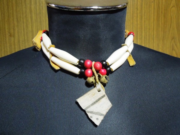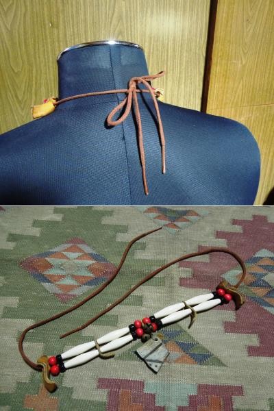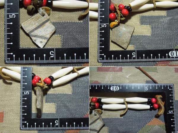 | 商品説明 | アメリカのインディアン居留地のトレーディングポストで 購入した アンティーク土器の破片をヘッドにしたチョーカー 他のビーズは 木製と樹脂に 革を組み合わせ シニュー(イミテーション・ナイロン糸)で 組み 後ろの結ぶ部分は 靴ひもを使っているようです。 ロングビーズ8個・赤ビーズ8個・黒ビーズ8個 土器の破片、ビーズのサイズは定規を置いた画像があります。参考にしてください。 実寸サイズ 長さ(革紐を含まず左右のビーズからビーズまで)-約220mm 靴紐の長さは それぞれ 約34cmと約30cm有ります。 重さ ・約37g(家庭用の計りで 計っていますので 誤差が出る 可能性があります。) 他にも シルバーアクセサリーやカントリー雑貨等を 出品してますので お好きな方は 見て下さい。 出品物は チョーカーで その他備品は 付きません |