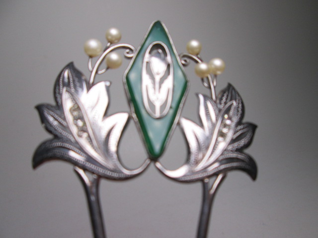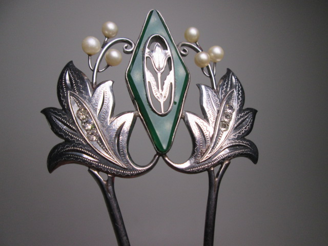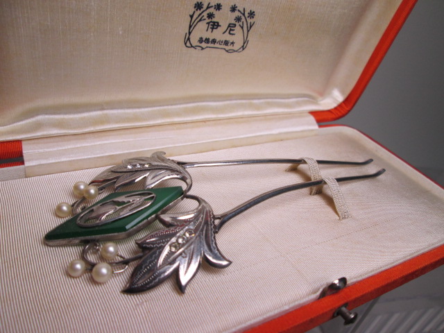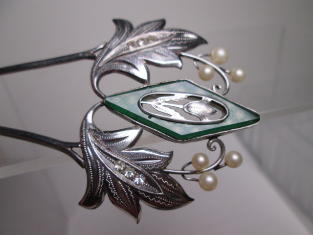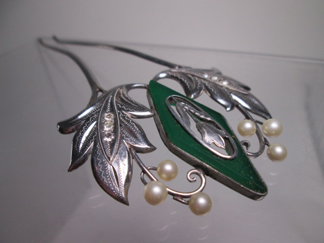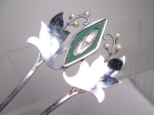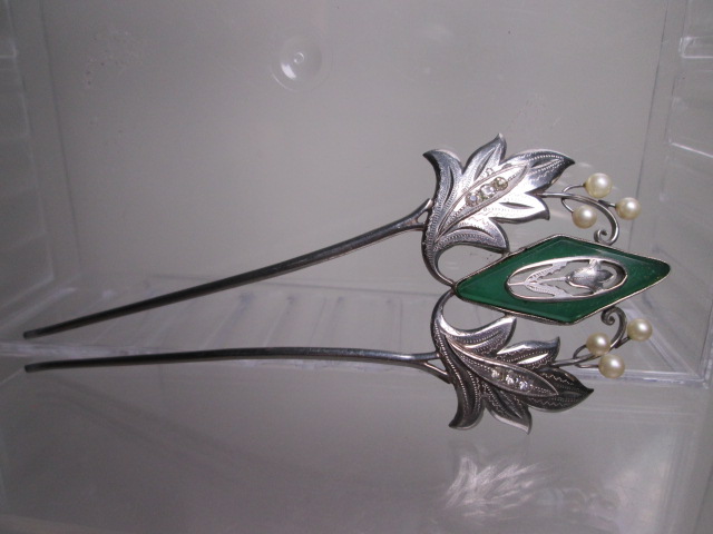 【江月】アンティーク・尼伊 彫金細工緑石&真珠飾りのかんざし 共ケース付