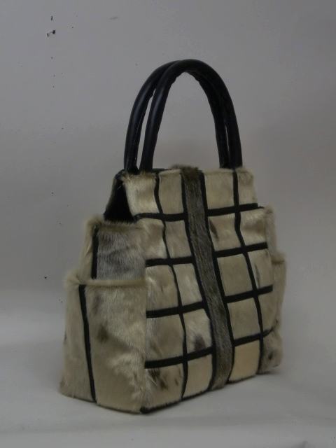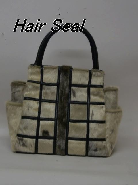 『水に強く汚れにくい毛皮アザラシ』デザインワークしたバッグです。両脇にポケットを持ち手は持ちやすい丸型にした