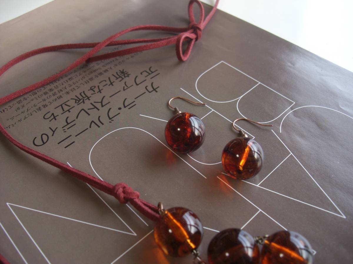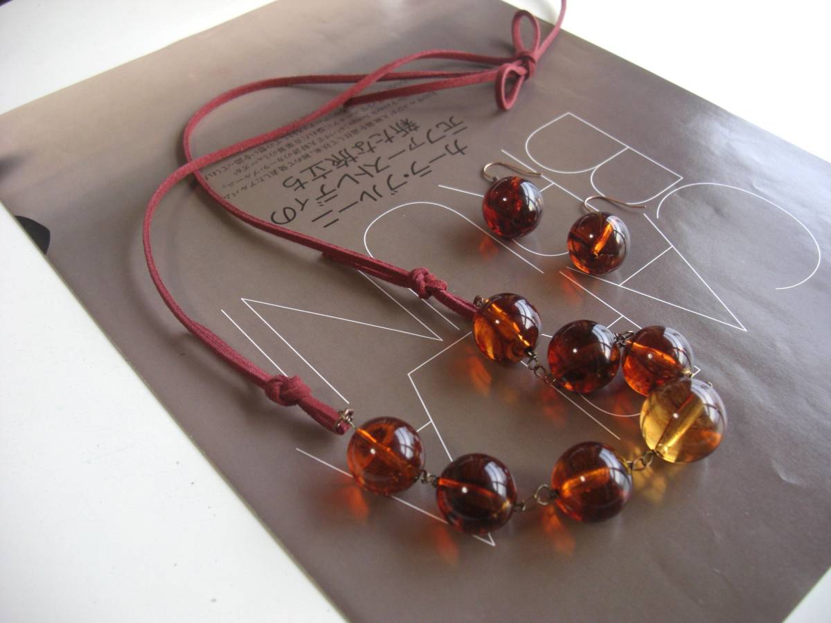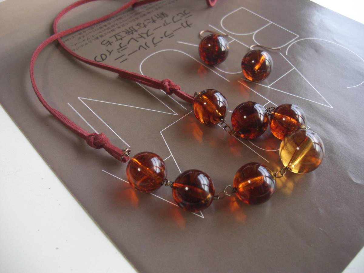 秋色・デッサン・・シリーズです♪琥珀色に恋して・・シックな琥珀色の樹脂玉のネックレスとピアスのセットです♪18ミリから20ミリ位までの丸玉を紡ぎました♪ネックレスはダークレッドのスェード紐を合わせてさりげなく大人可愛い表情です♪紐で長さを調整してカジュアルからロマンチックまで楽しんでいただきたいです♪長さは最長80センチ位まで調節出来ます♪チョーカー風に着けられても可愛いです♪ピアスは18ミリの琥珀玉です♪イヤリングにも変更出来ます♪シンプルで飽きのこないいつまでも着けられるデザインを考えて作りました!ハンドメイドをご理解頂いてノークレー ム、ノーリターンでお願いします