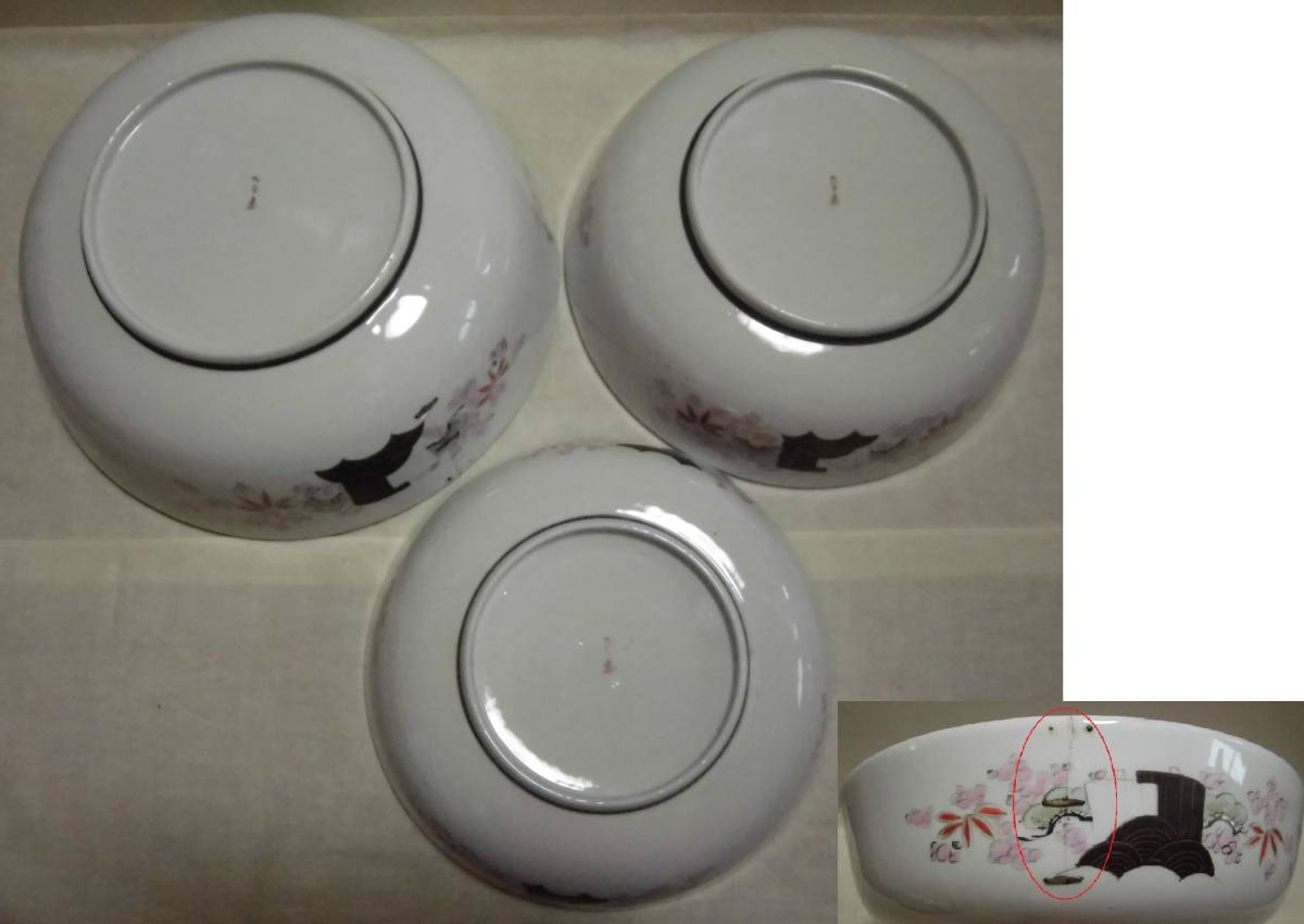 かなり古い物です、私見ですが、大の鉢にヒビの直しが有ります、3枚目写真右下赤丸部を参照願います、その他は多少擦り傷は有りますが美品になると思います。