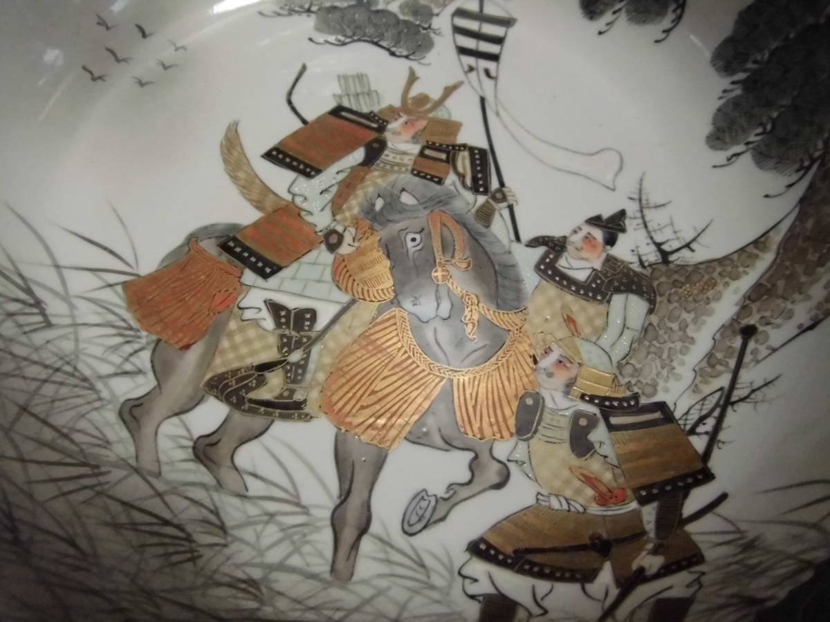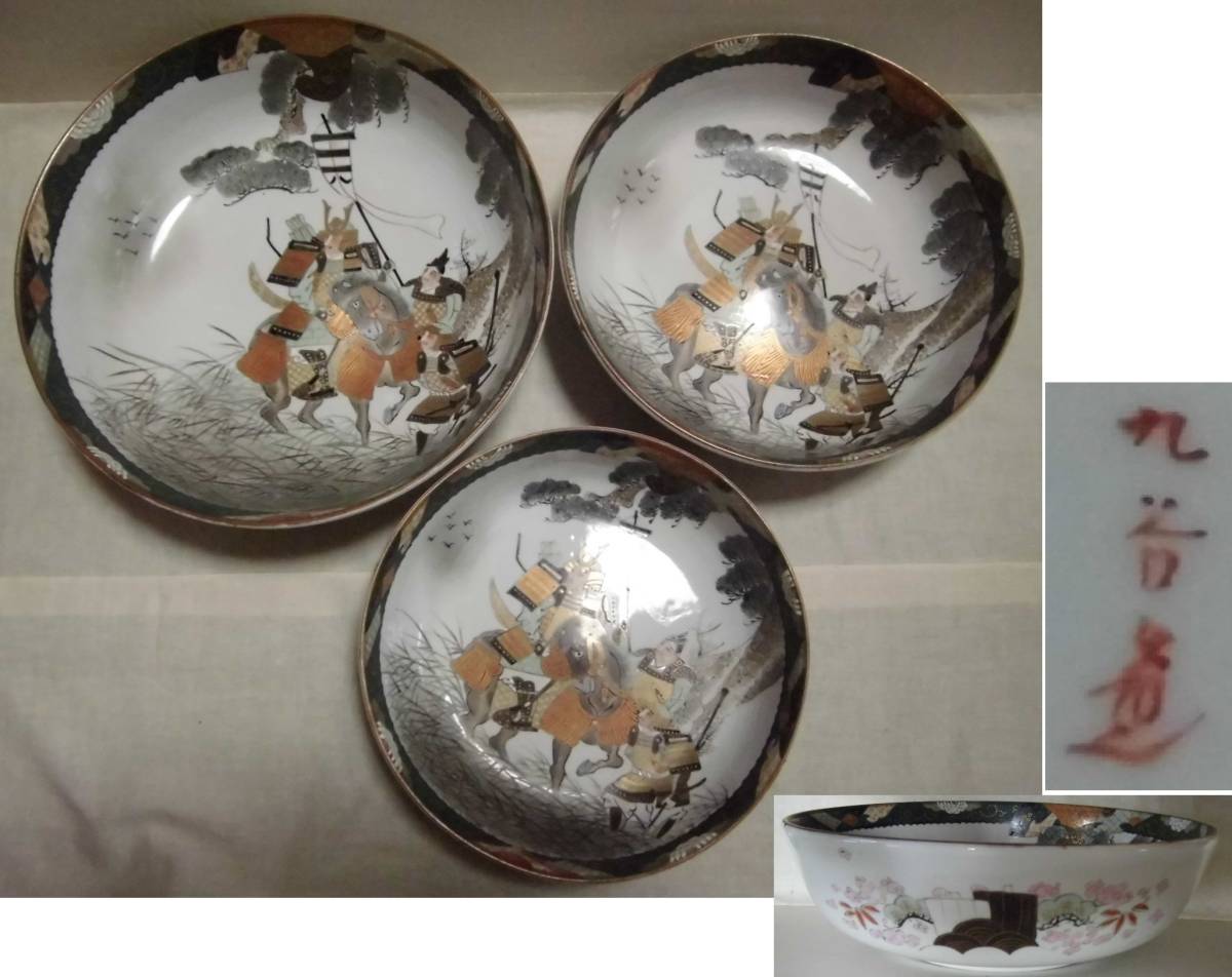 古い 九谷焼 大鉢 飾鉢 大中小 三つ揃え 盛鉢 計3点 九谷造 武者絵 金彩 青粒 30.5cm 絵鉢 馬に武将 鎧兜 三ツ揃え 陶器 工芸品 レトロ