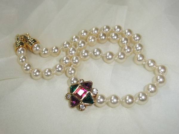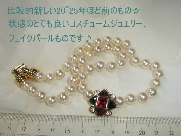 画像の、きれいめデザインがとても素敵なコスチュームジュエリー、状態の良い古いフェイクパールのネックレスです☆