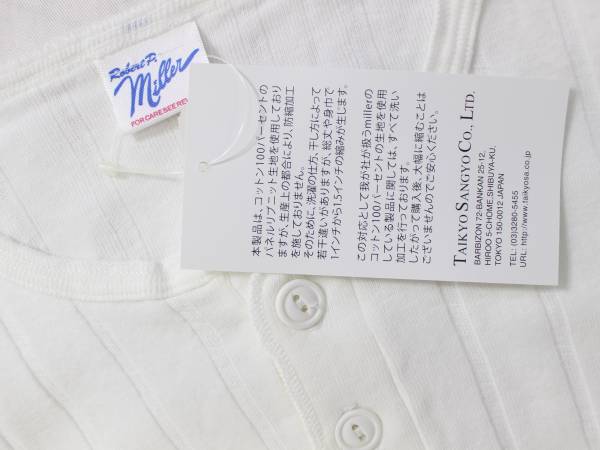 1937年にTHE ROBERT P.MILLERがアーカンソー州フェーエットビルにて立ち上げたラインの1つで、現在ではアメリカを代表するアンダーウェア・メーカーです。 日本でも高く評価され、タンクトップと言えばMILLERと挙げられる程に流行したMILLERの商品は、コットン100%のパネルリブニットを使用し、生産はすべてMade In USA♪ シンプルながらもシルエットの美しさ、機能性の高さは多くのユーザーに高評価を得ています。 インナーとしてもご使用していだたけますので、季節を問わず一年中活躍してくれます♪♪