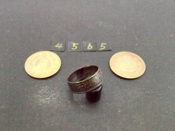 この商品は、昭和13年発行の カラス1銭黄銅貨を使用し、貨幣に穴を明け木槌で叩いてリングに成形した1点ものです。