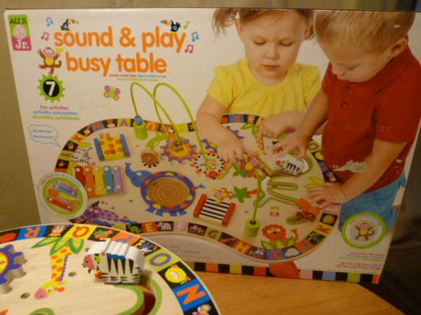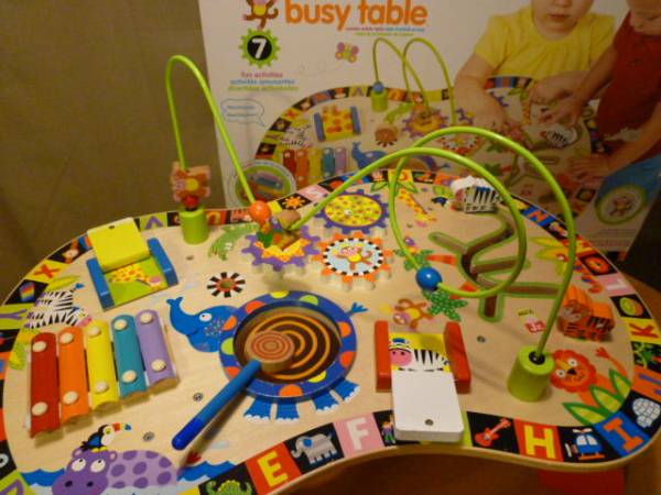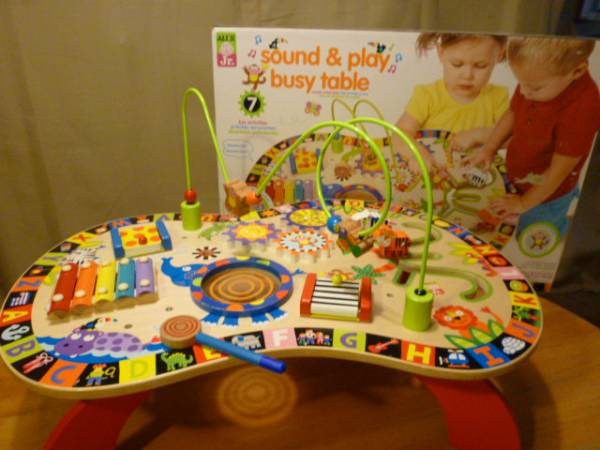 こちらは外国製の木製テーブル式の手先遊びの様です。テーブル面一杯にカラフルな動物達のイラストや立体的にスライドするもの 同様絵の歯車回し 模様の扉を開くとその模様に合った動物のイラストが現れ、 ゾウさんの大きなお腹は太鼓に 隣には小型の鉄琴も 立体式に取り付けられた回転ループのおサルやインコはスライド出来 周囲にはA~Zまでの文字とその頭文字に相当する動物やおもちゃ等のイラストを間に挟んであり英語のお勉強も出来る等沢山の遊びで大忙しのテーブルで、4本の脚と回転ループは裏よりネジ式に取り付けるタイプです。