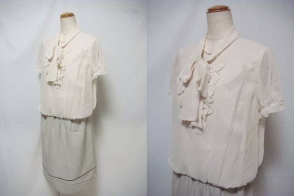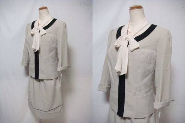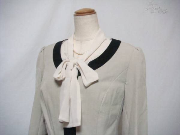 A775新品♪ノーカラーJKボウタイ付きフリル使いドッキングワンピーススーツ15号オフィス通勤即決