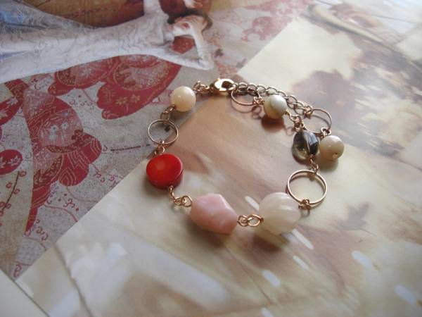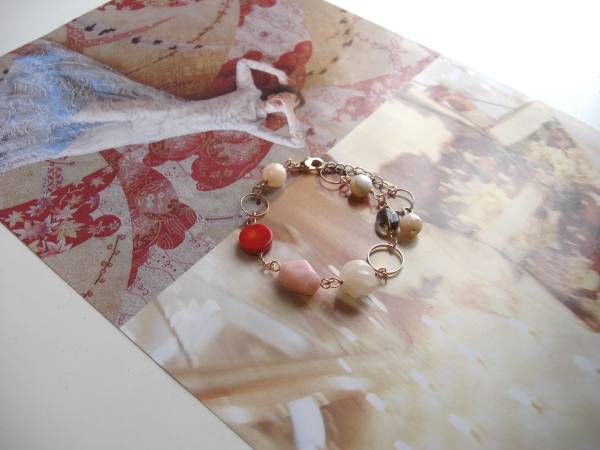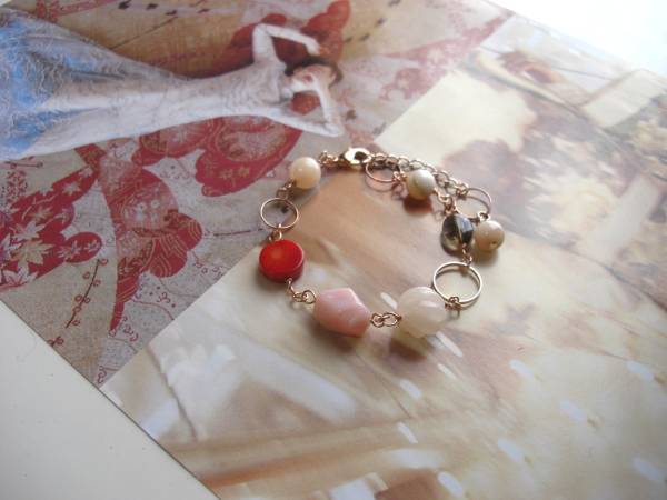 ルーズ・シルエット・・シリーズです♪幸せな時間・・シックなピンクオパールのブレスレットです♪8ミリから12ミリ位までの丸玉やラフカットやコイン、 オーバルなどデザイン違いのピンクオパール、赤珊瑚やスモーキークォーツやピーチクォーツやデザインリングにピンクゴールドのチェーンを合わせて大人のロ マンチックしています♪長さは全長23センチ位で調節自由です♪お揃いのネックレスも出品しています♪シンプルで飽きのこないいつまでも着けられるデザインを考えて作りました!ハンドメイドをご理解頂いてノー クレーム、ノーリターンでお願いします