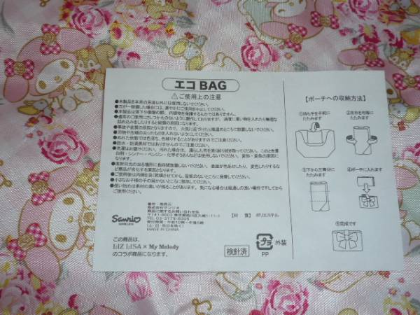 ☆商品説明☆ ご覧いただきありがとうございます^^ サンリオ リズメロ当りくじ リズリサ×マイメロディ エコBAGです!エコバッグをポーチに収納することができます。エコバッグの大きさは持ち手からタテ 約45cm、ヨコ 約41cmです。マイメロディキャラクターの絵柄いっぱいでと~ってもかわいいですよ^^コレクション用として袋に入れたまま大切に保管していましたので新品、未使用でたいへんきれいな状態ですが、家庭での保管ですのでご理解いただける方のご入札をお願い致します。☆発送方法☆ 定形外郵便、ゆうぱっく ☆コメント☆ ノークレーム、ノーリターンでお願いします。ご不明な点がございましたらお気軽にお問合わせ下さい。他にもマイメロディキャラクターグッズたくさん出品しております☆ 良かったらご覧下さいね*^^*