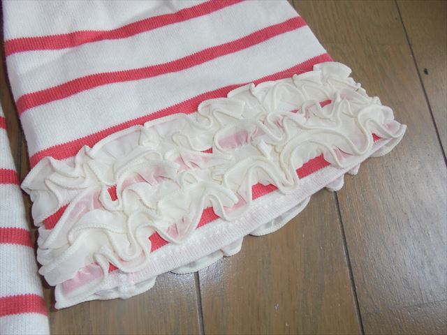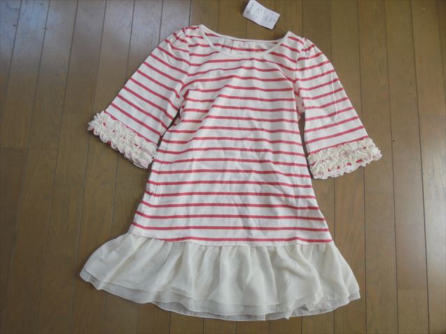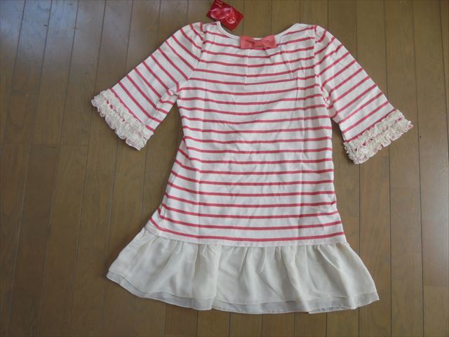 商品説明 新品★白フリル付きピンクボーダーの丈長半袖カットソー★M