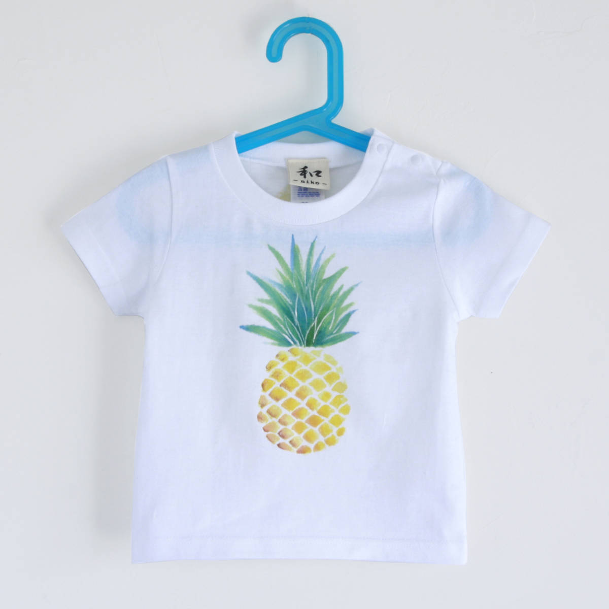 | ご覧いただきありがとうございます。 一つ一つ丁寧に手描きで絵付けし、筆跡やカスレなどがプリントTシャツとは一味ちがう手描きならではの味わいとなっております。 前面真ん中に水彩画のタッチで描かれたパイナップルは大人っぽいオシャレなトロピカルで爽やかな夏らしいデザインのTシャツです。 後ろの襟首にはパイナップルの輪切りをワンポインで描いています。 男の子女の子性別を問わず着られるデザインなので兄弟、姉妹でお揃いもオススメです。 誕生日プレゼントお祝い、ギフトにもおすすめの一枚です。 カラー:ホワイト サイズ:150 150:身丈59㎝ 身幅42㎝ 肩幅38㎝ 袖丈17㎝ ※ 90サイズには肩部分に樹脂製のスナップボタンがつきます、それ以外のサイズにはボタンはつきません。 素材:綿100% Tシャツ素材について:5.6オンス 胴仕上げ 首リブはダブルステッチ しっかりふっくらとした生地のハイクオリティなTシャツ、繰り返しの洗濯にもよれないコシのあるリブはTシャツ好きさんには納得していただける素材のTシャツを使用しております。 その他別のボディカラーやレディースサイズ、キッズサイズ、長袖素材、名前入れなどにも対応できますのでお気軽にご相談下さい。 | |||