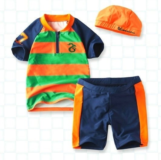 【新作】男子UVカット 帽子付き3点セット水着(オレンジ緑)130