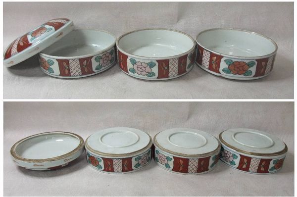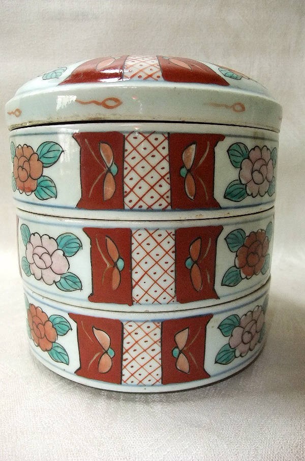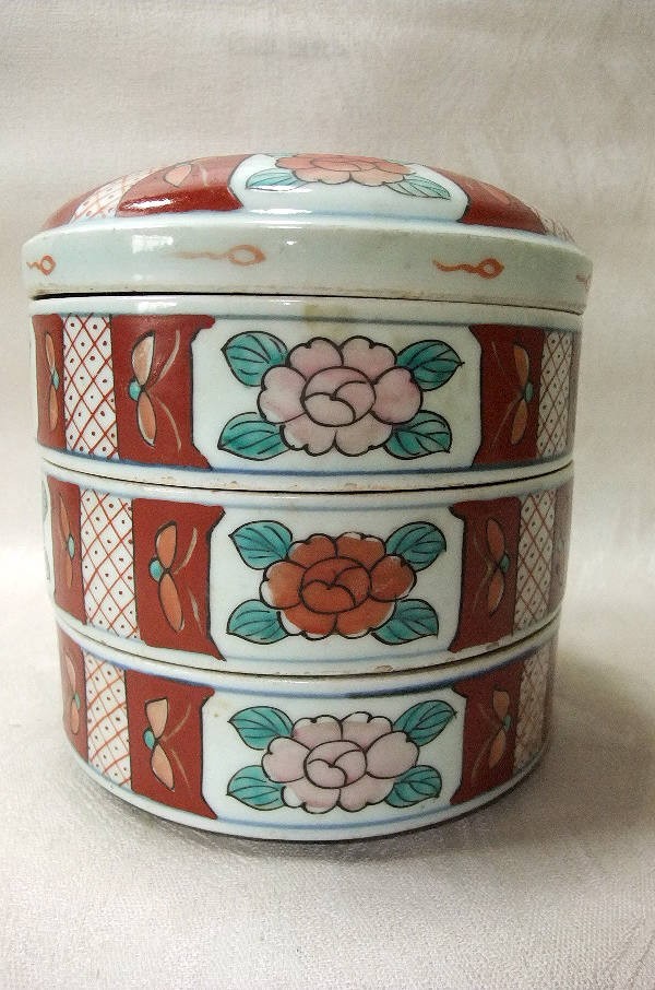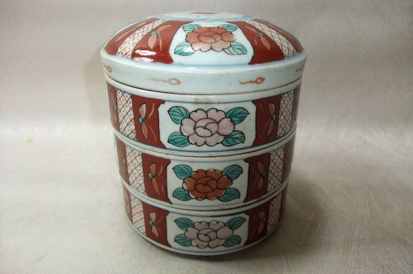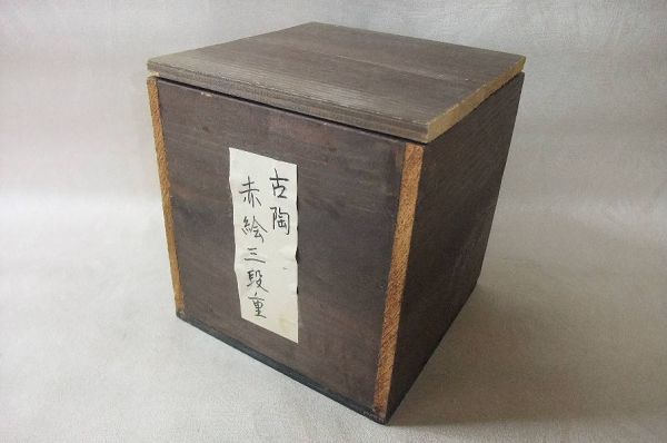 【睦】赤絵 三段重 京焼 清水焼 明治期 在銘 木箱■