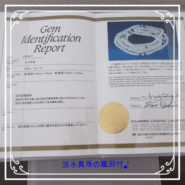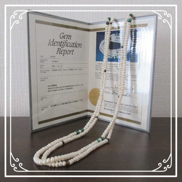 鑑別書もついた高級なジュエリーですが,天然のものです。剥けやキズ、突起がある珠もありますので、写真にてご確認下さい。