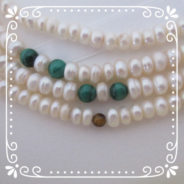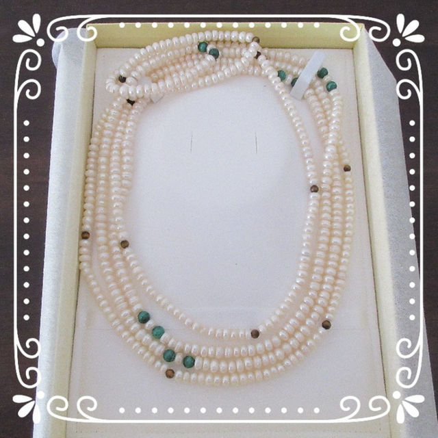 淡水真珠と天然石(詳しくないのであえて不明とさせていただきます)を使用した,ロングネックレス2本セットです(#^.^#)展示品の新品です。一つが緑,もう一つが茶色と色が異なるので,それぞれ1本ずつ,さらに2本で3WAYでお使いいただけます。
