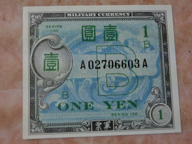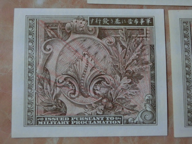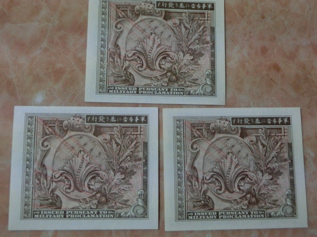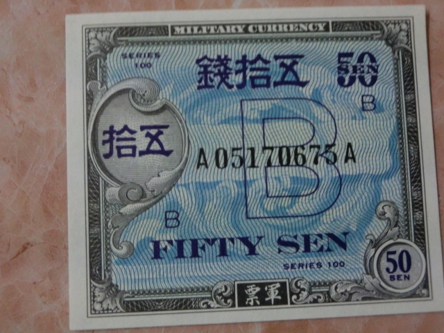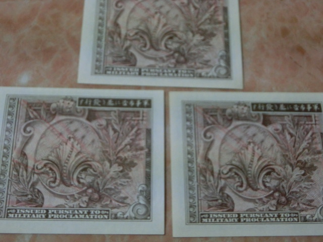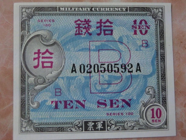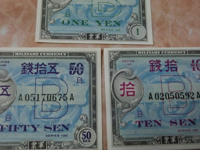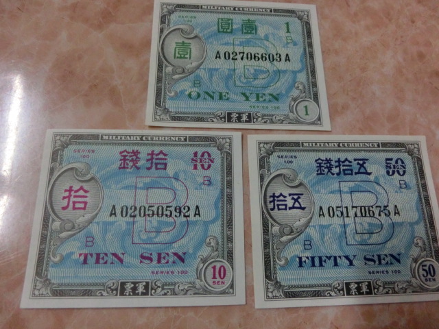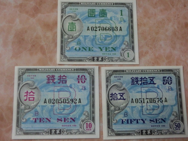 在日米軍軍票 B10銭・B50銭・B1円券の未使用を3種3枚です。