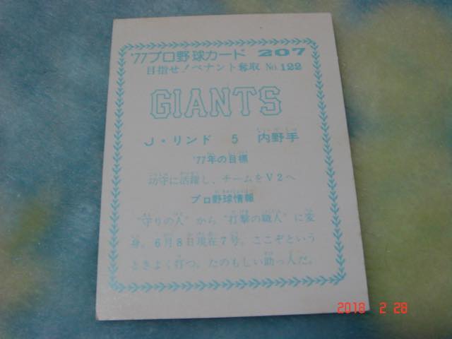 *カルビー '77年 プロ野球カード NO.207 (J・リンド/巨人) 青版*