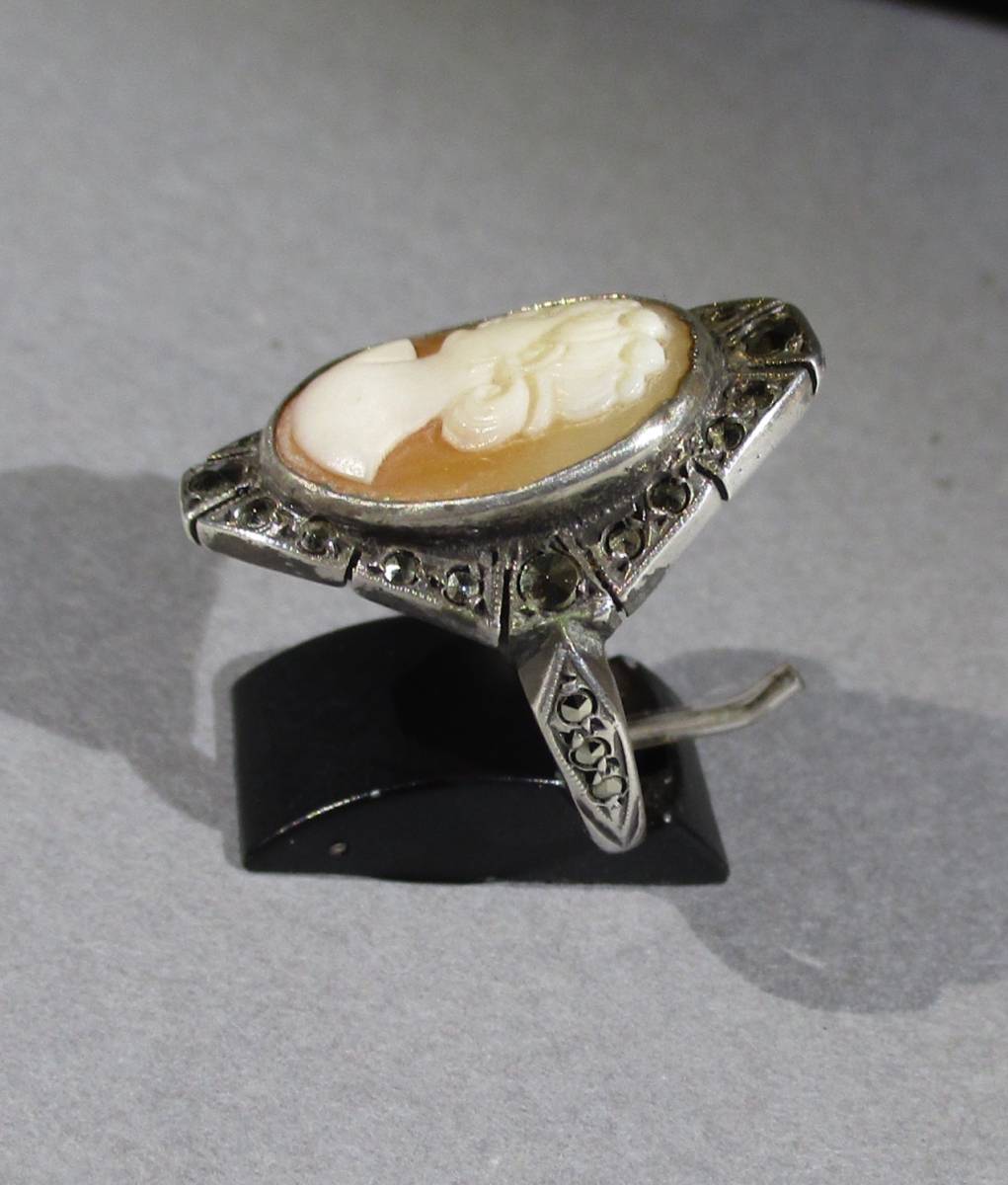 1950年頃のカメオリングです。銀の台にシエルカメオのリングです。シャンクの部分は9金です。石はマルカザイトです。