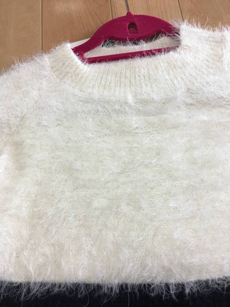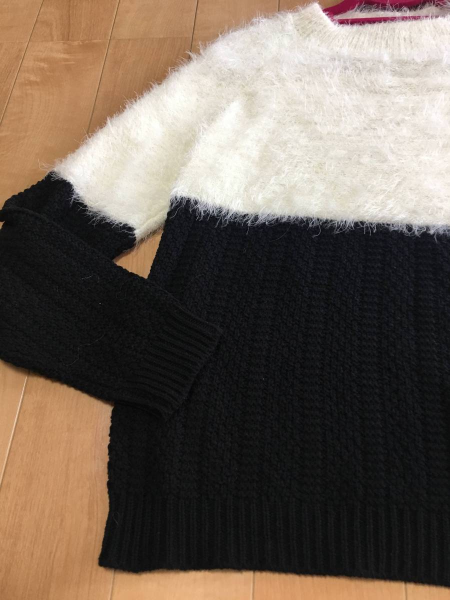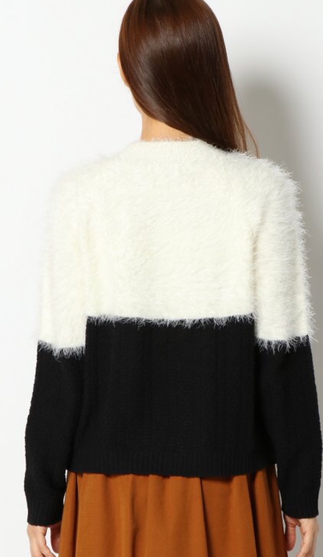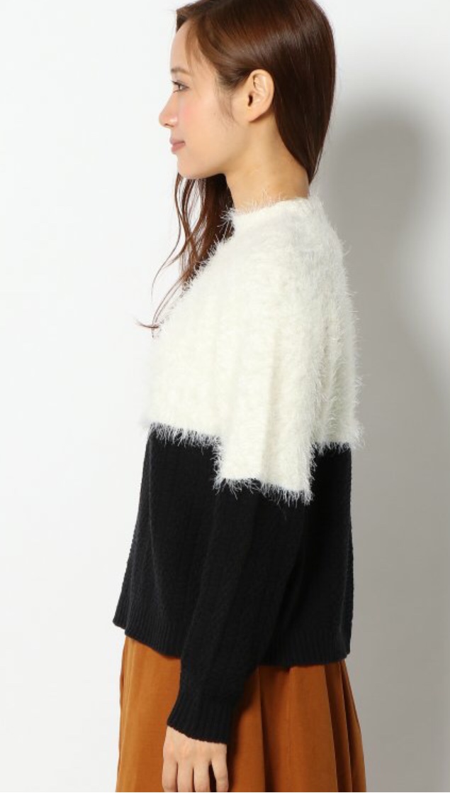 ふわふわタッチに癒されるフェザーヤーンとケーブルニットを切り替えたワザありな一着です。