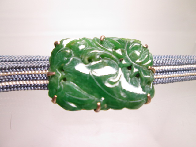 【江月】☆K10 本翡翠 草花彫刻帯留め 5.3 g ケース付