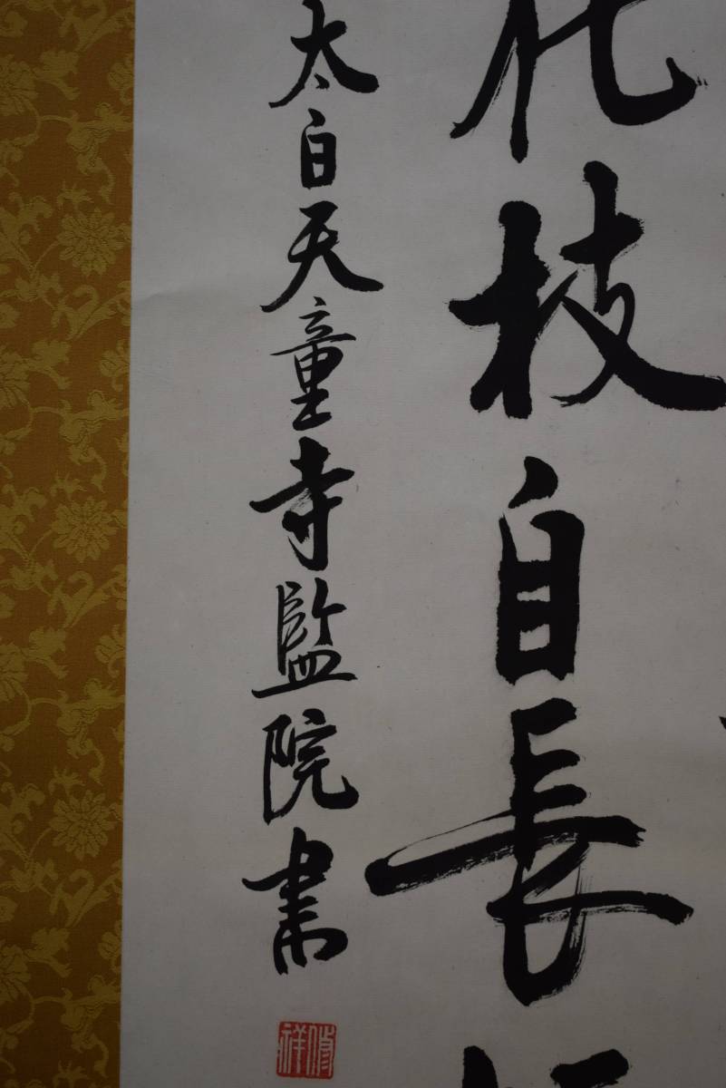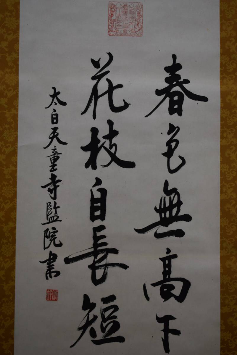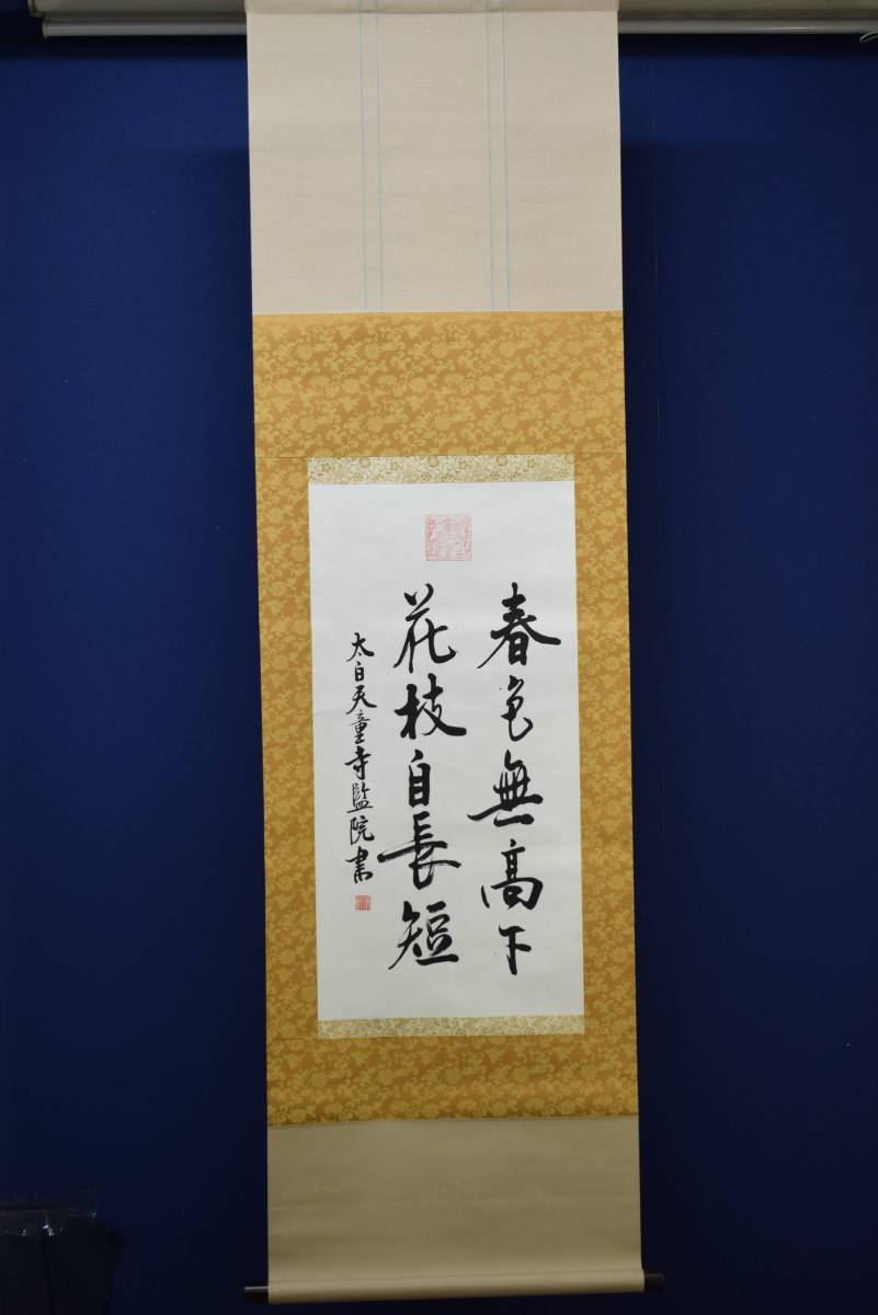 【真作】/天童寺/座首/監院/二行書/ 【参考】 天童寺 座首 監院 二行書 【作品状態】 本紙は紙本です。 本紙・表装共に良好です。 紙箱付 軸丈 縦 162㎝×幅 52㎝ 写真で状態をご判断の上、宜しくお願い致します。 ≪注意事項≫ ※質問などについては常時チェックが出来ない為、直ぐにお応え場出来ない場合があります。 ※商品説明・写真をご確認の上、十分にご検討頂きご入札をお願い致します。 ※【真作】と明記のある作品について万一、所定鑑定機関にて真作でないと鑑定された場合は内容証明書を 提示頂ければ返品をお受けし、商品代金のみ返金致します。返品は落札後10日間です。 ご理解の程、宜しくお願い申し上げます。 ≪お知らせ事項≫ 一両日中に2点以上ご落札頂いた上、同梱発送の場合は送料無料に致します。 屋号を布袋屋と致しました。布袋屋は別IDでも多数出品しておりますので、布袋屋掛軸と検索してみて下さい。宜しくお願い致します。 ≪Yahoo!ルール改定≫ 2017年10月25日よりYahoo!の≪絵画の出品に関するルール改定≫が施行されました。 この改定により特定の作者の作品としている場合は、タイトル頭標記へ【真作】または【模写】と明記する事となりました。 タイトル頭標記の分類は下記と致します。 【真作】真作(絵画)・真筆(書)作品の事。 【模写】印刷や工芸等ではなく、人が描いた(書いた)作品の事。 (所定鑑定機関の鑑定が無い作品、僅かでも真作ではないと疑いのある作品、 当方で判断出来ない作品、落款や号は分かっているが フルネームが不明な作者不詳の作品も全て【模写】と表記致します。) 【版画】リトグラフ・木版画・水印版画・銅版画・拓本・石刷作品の事。 【複製】印刷・工芸・工藝作品の事。 【不詳】作者の落款・印章が読めない作者不詳作品。 又は、無落款・無印章で作者不明作品の事。 (これについては特定の作者の作品と見なされる場合があるので【模写】【不詳】とします。)