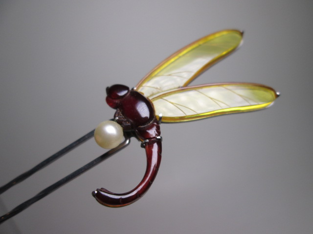 【江月】アンティーク・本鼈甲&天然琥珀真珠飾り蜻蛉のかんざし 共ケース