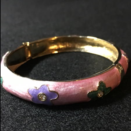 こちらは、景泰藍(七宝焼き)を使用して、愛らしい花模様の細工を施し、所々にプチダイヤを配置する、お洒落で素敵なブレスレット(バングルタイプ)に仕上げられたものです。