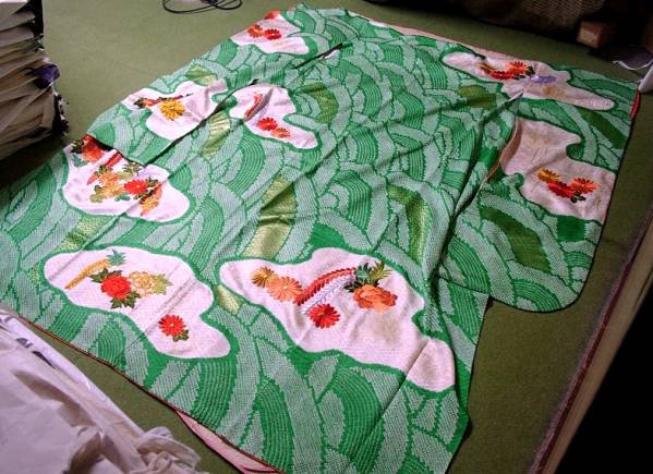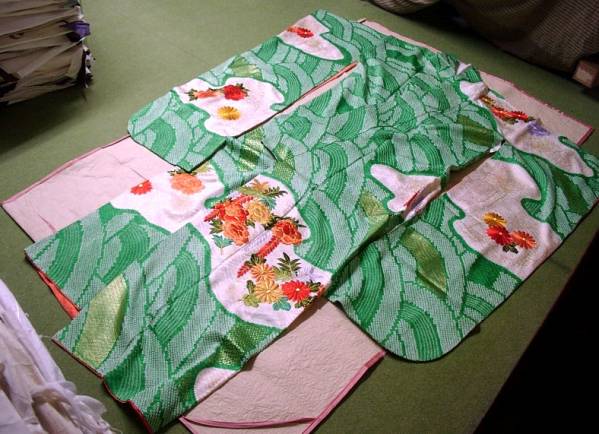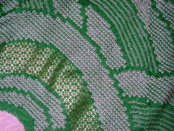 高級振袖です。紗綾形の地紋に、黄緑色の総絞りで青海波、牡丹、藤、菊、花菱などが表されています。和刺繍も使われ豪華で艶やかです。薄い汚れがありますが着用時には目立ちません。松坂屋で購入仕立てた物です。上代は〇十万円です。お勧めの商品です。