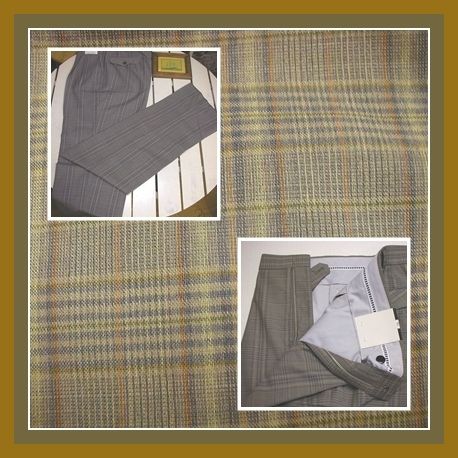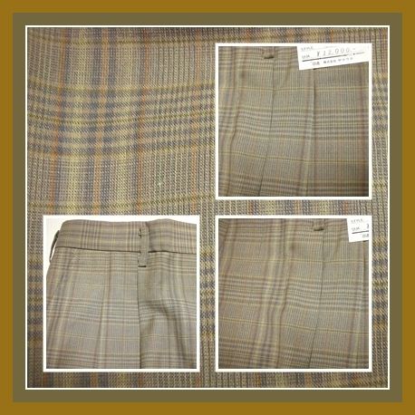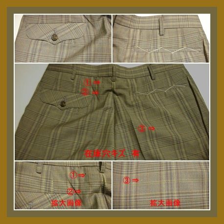 個性派のプレーンチェック柄 アウトツータックパンツです。涼しい快適薄地素材 細糸使用の 毛 60% ポリエステル 40% の はき心地の良い生地です。色は 上品なライトモスグリーン ゴールド モスブルー色等のプレーンチェック柄です。サイズ(平置実測採寸)は ウエスト 実測 81cm (表示 82cm ) 渡り幅 35,5cm 腿幅(股下 10cmの所) 32cm 裾幅 23cm 前股上 28,5cm 股下(フリー状態) 89cmです。勿論 新品ですので、ご希望どおりの長さ等で裾上げして、着用して頂けます。 そして、御希望により 裾上げ修理等も 実費にて承ります。ただ 三番目画像で示す様に ウエスト後 左サイドポケット横 裾 部分 等に穴キズ有りのジャンク品です。その為 ジャンク度レベルにより 超安値の処分価格スタートとなります。よって お買い得となっております。普段着 仕事衣 等としても ご活用下さい。 尚 毎週木曜日は業務定休日で御座います。ご連絡御発送とも休業日明けにずれ込む事御了承下さい。 以上宜しくお願い申し上げます。