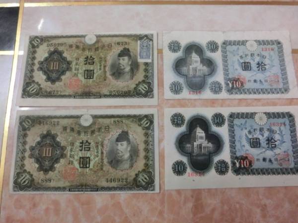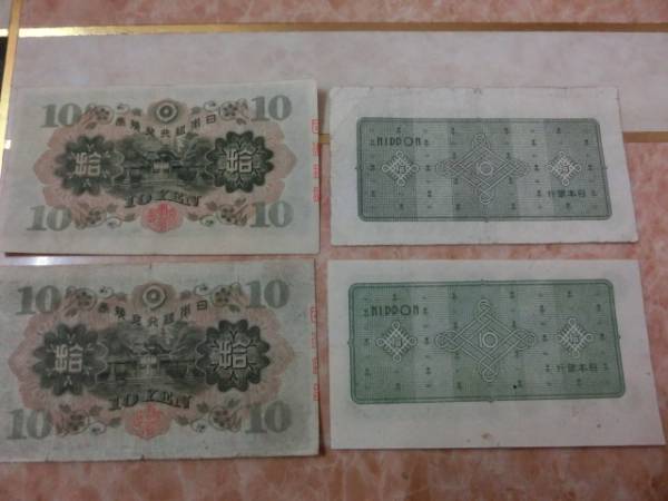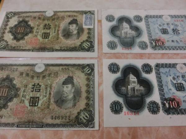 兌換券10円 1次10円を2枚・日本銀行券A号10円 議事堂10円を2枚の裁断ズレ有り4枚セットです。
