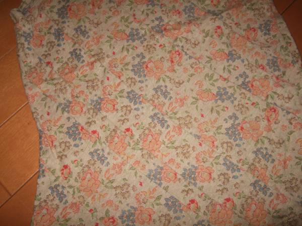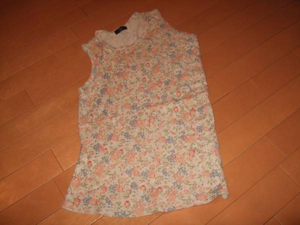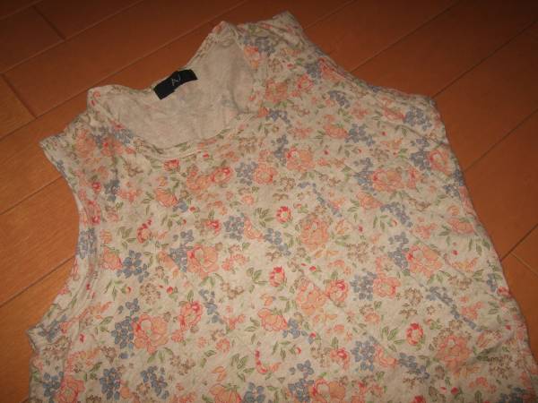 良品、A/T の花柄デザインタンクトップ、サイズ表示はありませんが、フリーの9号程度だと思います。素材はカットソー素材のコットン100、花柄がとてもかわいいのですが、左右の比重がアンバランスになったデザインがモダンで面白いです。いわゆる普通のタンクトップですが、デザイン的にひとひねりあって、とても素敵です。ユーズド品ですが普通に着用いただくには問題のない範囲です。多少の毛羽立ちはご了承ください。身幅約37、丈約59、伸縮もよくする着心地の良いカットソー素材です。ぜひご検討ください。