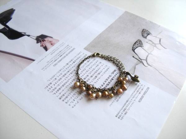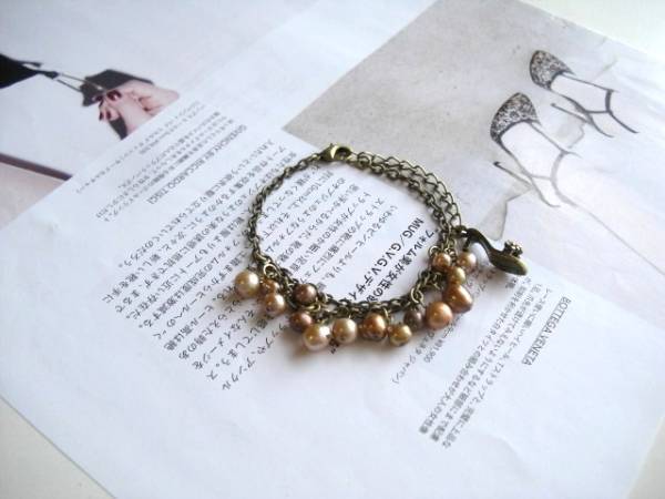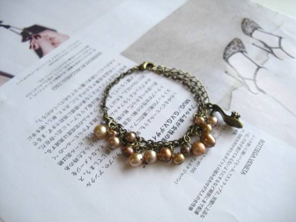 アンティーク仕様・・シリーズです♪大人色のパール・・シックなブロンズ色の淡水パールのブレスレットです♪3ミリから7ミリ位までのポテトやバロックの淡水パールを2連のチェーンに合わせてクラシカルな表情です♪さりげなく豪華な雰囲気です♪長さは16センチ+アジャスター6センチで最長22センチ位です♪お揃いのブレスレットやネックレスも出品しています♪シンプルで長く着けていただけるデザインを考えて作りました!ハンドメイドをご理解頂いてノークレーム、ノーリターンでお願いします
