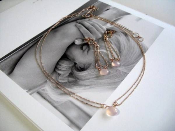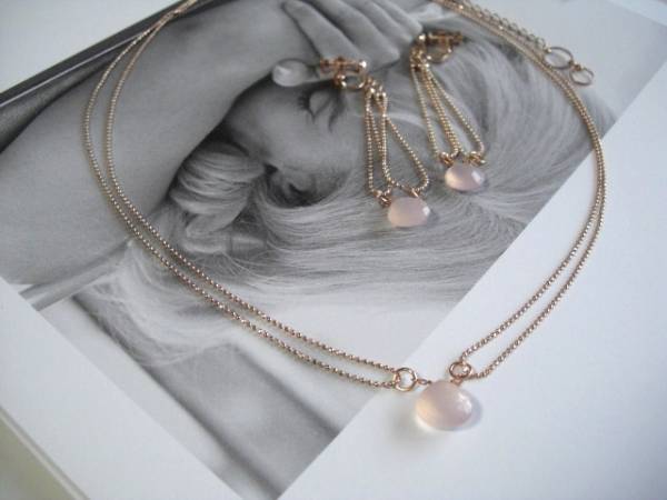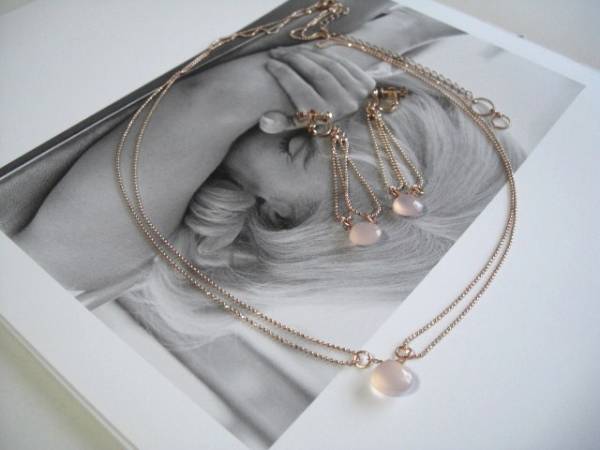小粋にセレクト・・シリーズです♪モンローに憧れて・・繊細なピンクカルセドニーのネックレスとイヤリングの2点セットです♪イヤリングはピアスに変更出来ます♪コロンと可愛いマロンシェイプのピンクカルセドニーにピンクゴールドのボールチェーンを2連にして可憐な表情です♪ネックレスのピンクカルセドニーは12ミリ位です♪長さは58センチ+アジャスター14センチで最長72センチ位です♪イヤリングは11ミリのピンクカルセドニーにピンクゴールドのチェーンを合わせました♪長さは全長7・5センチ位です♪それぞれ単品でも出品しています♪シンプルで飽きのこないいつまでも着けられるデザインを考えて作りました!ハンドメイドをご理解頂いてノークレーム、ノーリターンでお願いします
