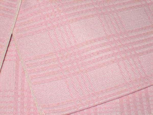 女性yukata用、地紋柄結び帯 薄ピンク(ラメあり) 同柄同色2点で1セット  ポリエステル  新品(織り地紋柄ありです。波状の写りはレンズの光学的ないたずらで現品にはありません、また薄く濃く写っている場合もあります)、胴部--帯巾約17,0cmx長さ約130cm、リボン部は横に約30cm。見た範囲で汚れないと思いますが、着用に差し支えない薄汚れ(多分ない?)はあってものお値段で出品です。91-92(182-183)