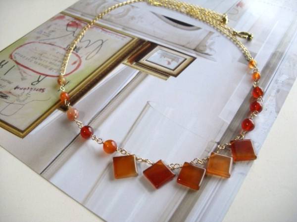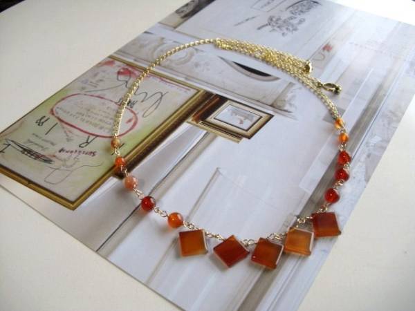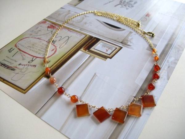 ニューヨーク・テイスト・・シリーズです♪やさしい春色・・ふんわりやさしいオレンジ色のカーネリアンのネックレスです♪丸玉やスクエアのカーネリアンを集めてニューヨーク・テイストのデザインです♪6ミリ、8ミリの丸玉、13ミリのスクエアのカーネリアンです♪ネックレスの長さは全長80センチで調節自由です♪チョーカー風に着けられても素敵です♪お揃いのブレスレットやピアスも出品しています♪シンプルで飽きのこないいつまでも着けられるデザインを考えて作りました!ハンドメイドをご理解頂いてノークレーム、ノーリターンでお願いします
